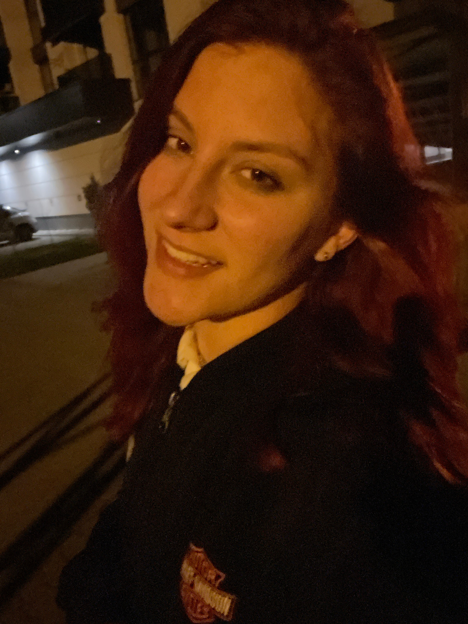 A woman with auburn hair smiles at the camera, wearing a dark jacket with a Harley Davidson logo patch visible on the right side. The background suggests an outdoor setting, possibly at night, with in…read more