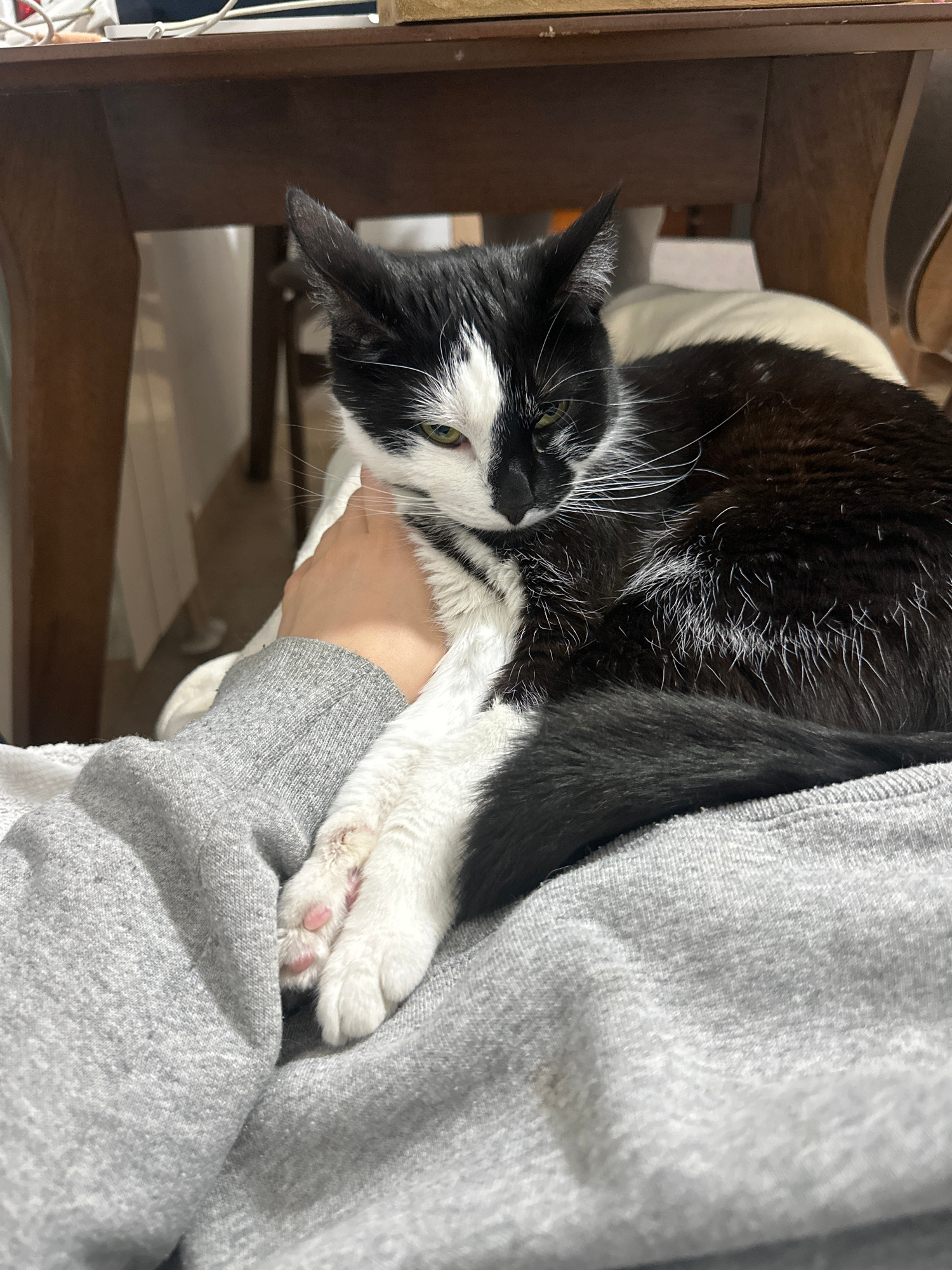 A black and white cat is nestled in the arm of a person wearing a gray sweatshirt. The cat's white paws are visible. The scene appears to be indoors, with parts of a wooden table and chair visible in…read more