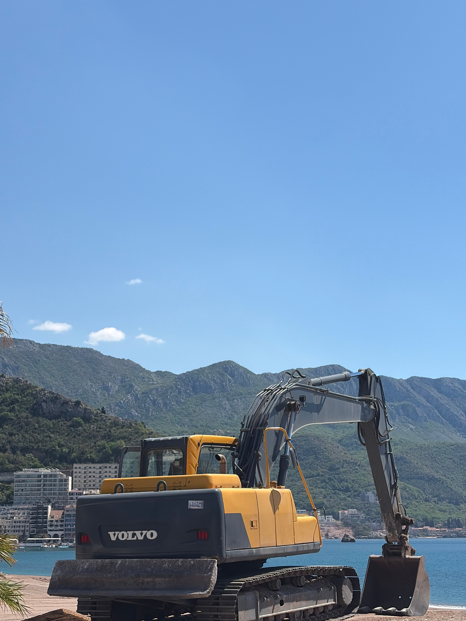 A Volvo excavator is positioned with mountains, the city of Bečići, Montenegro, and the sea as the backdrop. The excavator is predominantly yellow and grey, with the Volvo logo visible on the rear. Th…read more