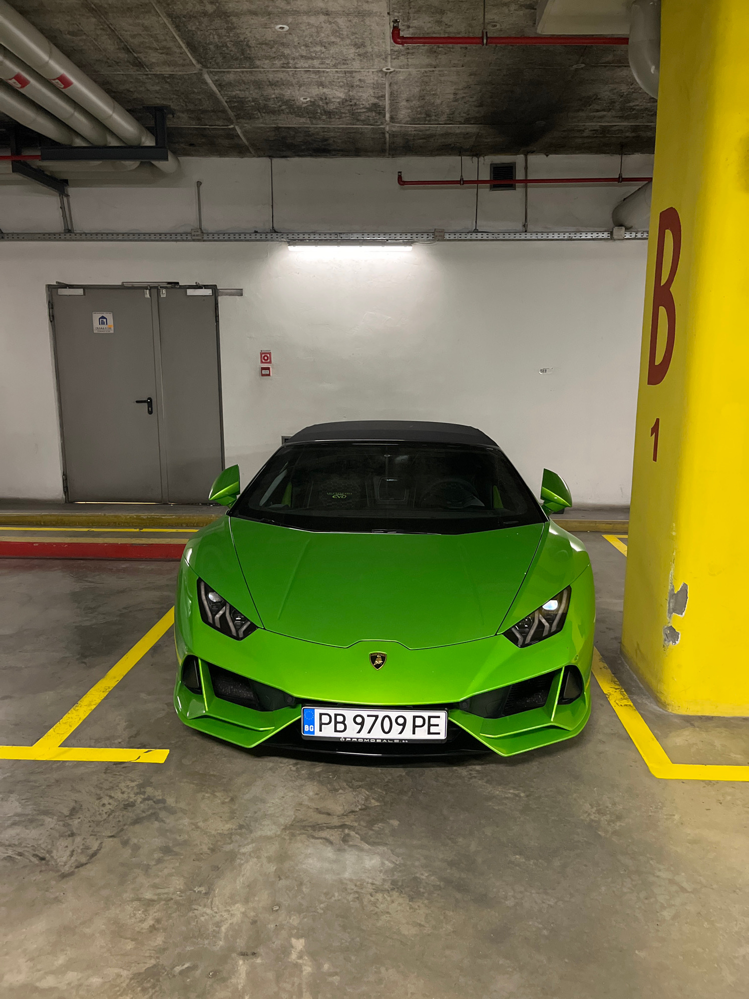 The image shows a green Lamborghini sports car parked in an indoor parking garage. The car has a Bulgarian license plate that reads "PB 9709 PE". The parking space is marked with yellow lines on a graβ¦read more