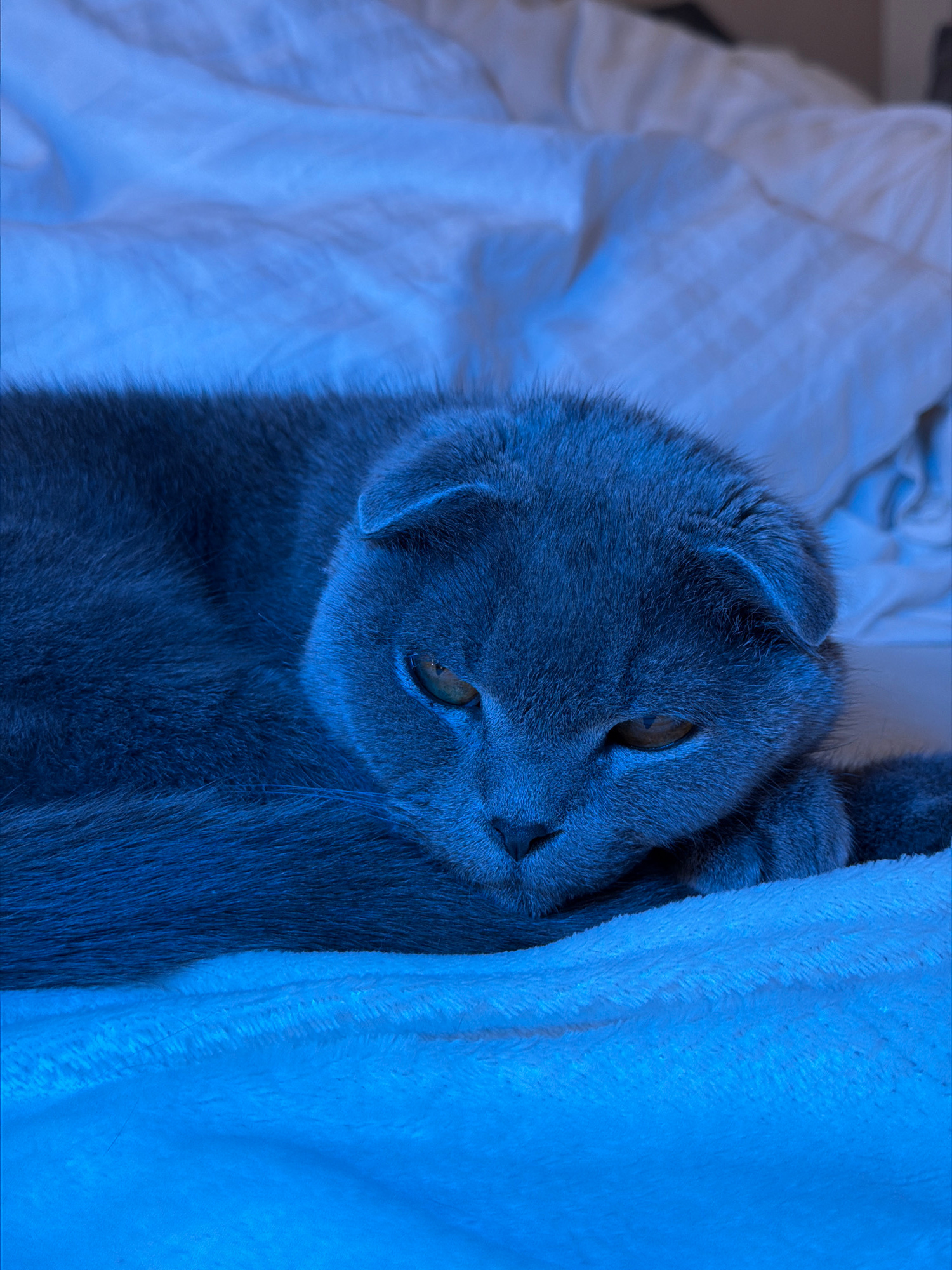 A grey Scottish Fold cat is lying on a white textured blanket or duvet. The cat is facing the viewer, with its head tilted slightly to the right. Its eyes are visible and appear to be yellow or amber…read more