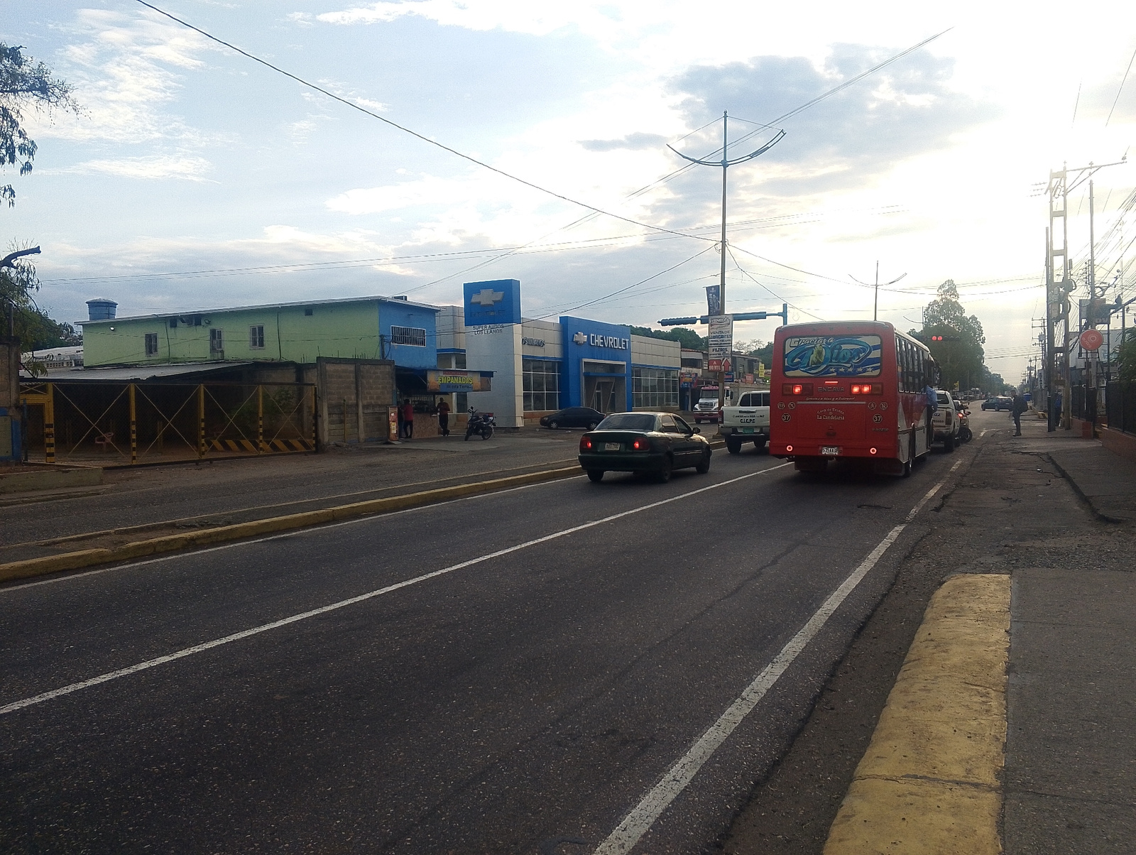 The image depicts a street scene in San Carlos, Venezuela, with a Chevrolet dealership prominently visible on the left side of the frame. The dealership features the Chevrolet logo and displays severa…read more