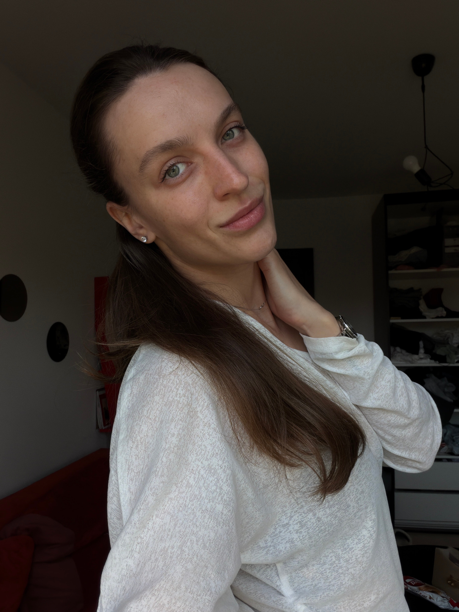 A woman with long, brown hair and green eyes is pictured indoors. She is wearing a light-colored shirt. Her left hand is near her neck. A wristwatch is visible on her left wrist. A light fixture and s…read more