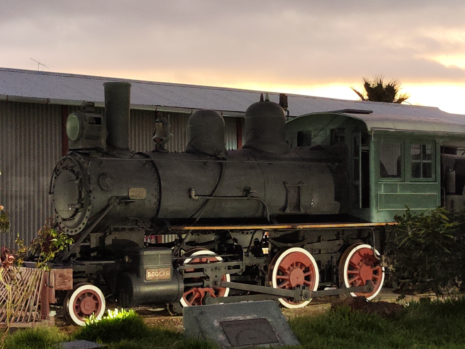 The image shows a stationary, black steam locomotive with red and white wheels on display in Tacna, Peru. The locomotive, labeled "ROGERS," is positioned on tracks and is partially obscured by foliageβ¦read more