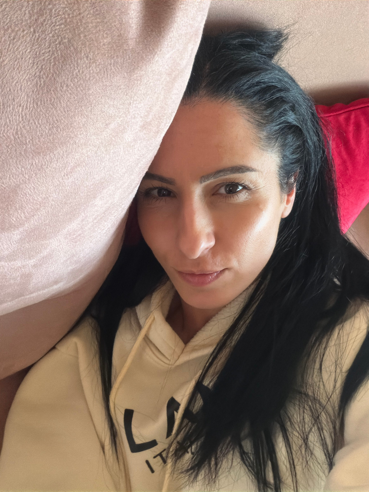 The image presents a top-down, close-up view of an adult female situated indoors in Pleven, Bulgaria. The subject has dark, long hair, parted on the side, and is looking directly into the camera. She…read more