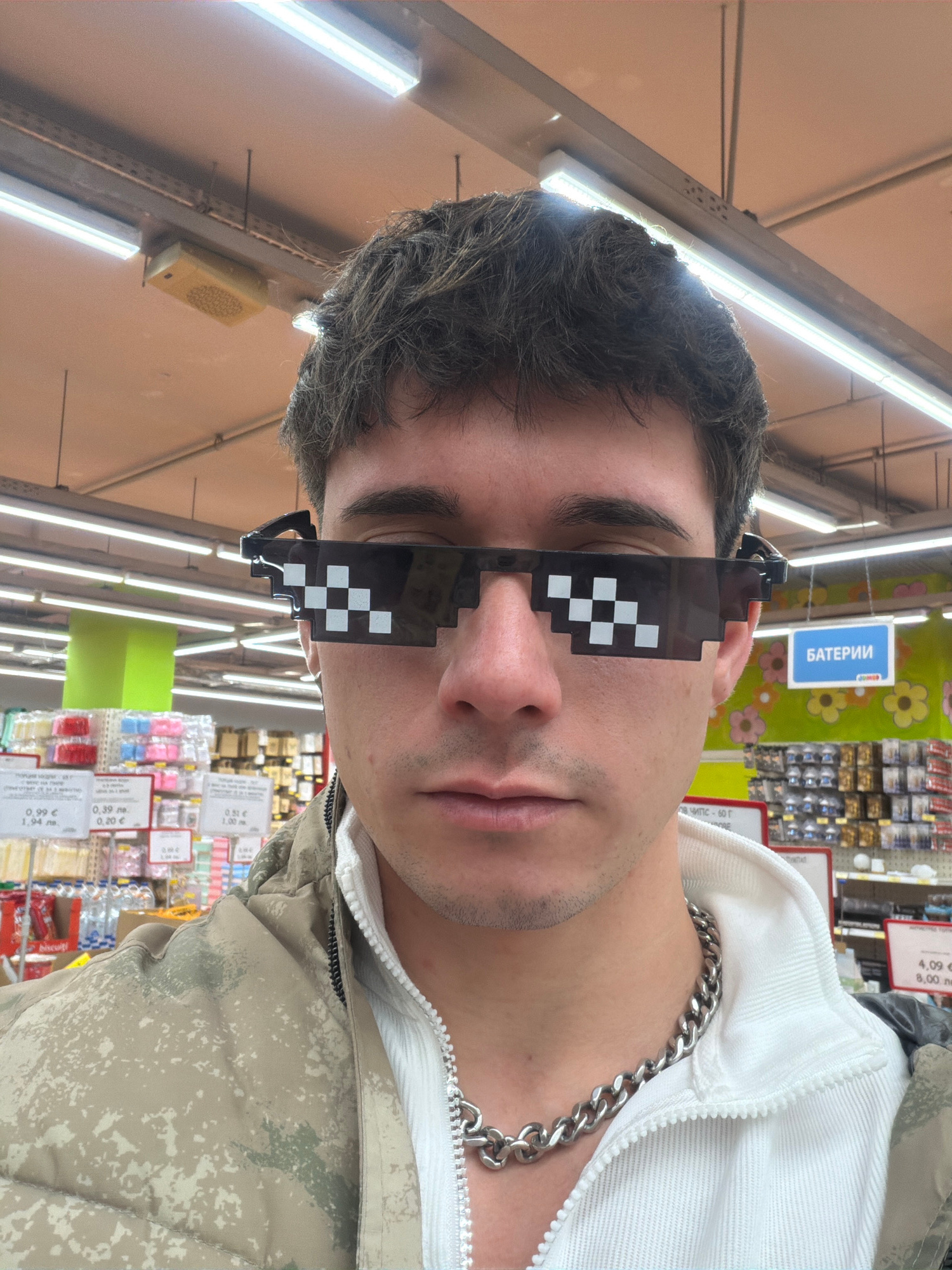 A young man wearing pixelated sunglasses and a silver chain is standing inside what appears to be a supermarket or a general store. The location is suggested to be Sofia, Bulgaria due to the Cyrillic…read more