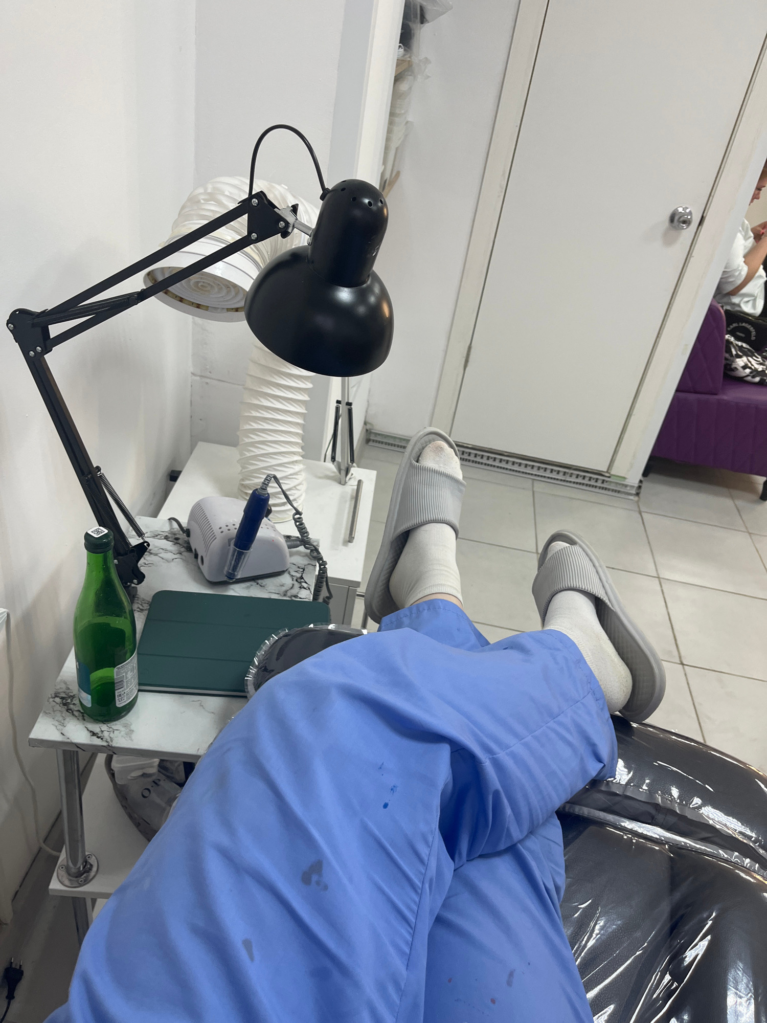 An indoor scene, rotated 90 degrees clockwise, depicts a professional setting, likely a nail salon, in Perm, Russia. In the foreground, a person's legs are visible, dressed in light blue scrubs or tr…read more
