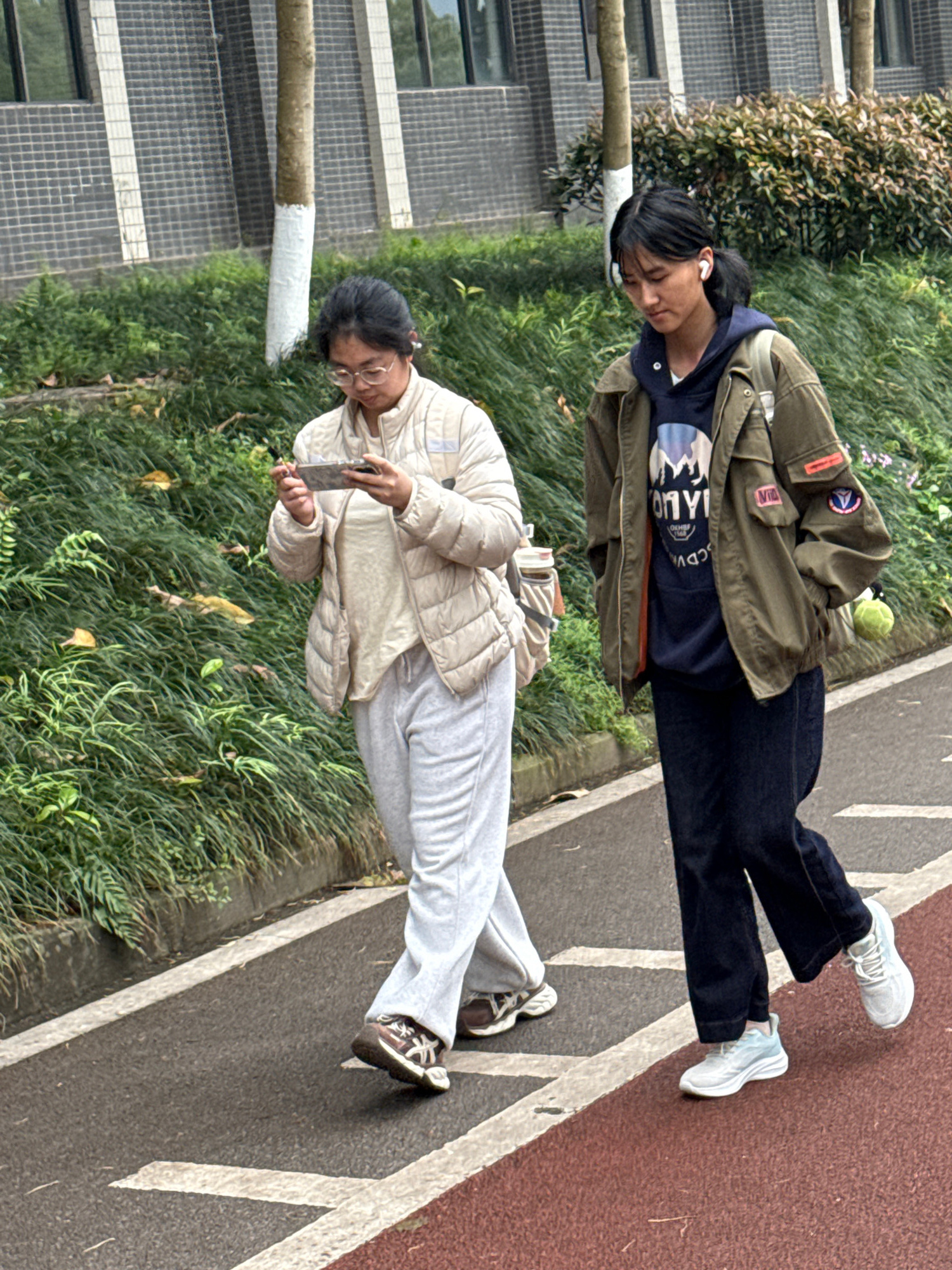 Two individuals stand on a paved walkway adjacent to grass and trees. The walkway is marked with white lines, with a red painted section alongside. A building is visible in the background. The first p…read more