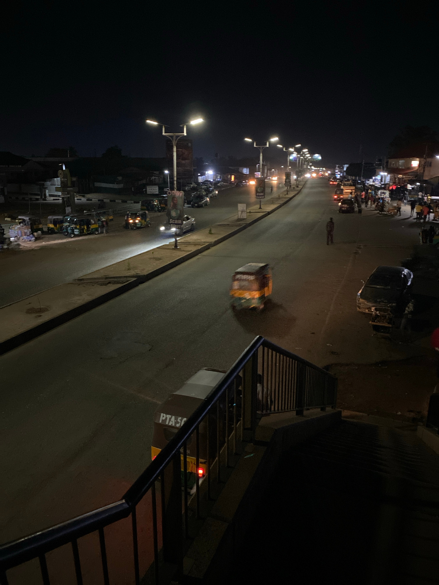 This image captures a busy urban street scene at night, viewed from an elevated perspective, likely an overpass or bridge, whose metal railing is visible on the right. The dark night sky contrasts wit…read more