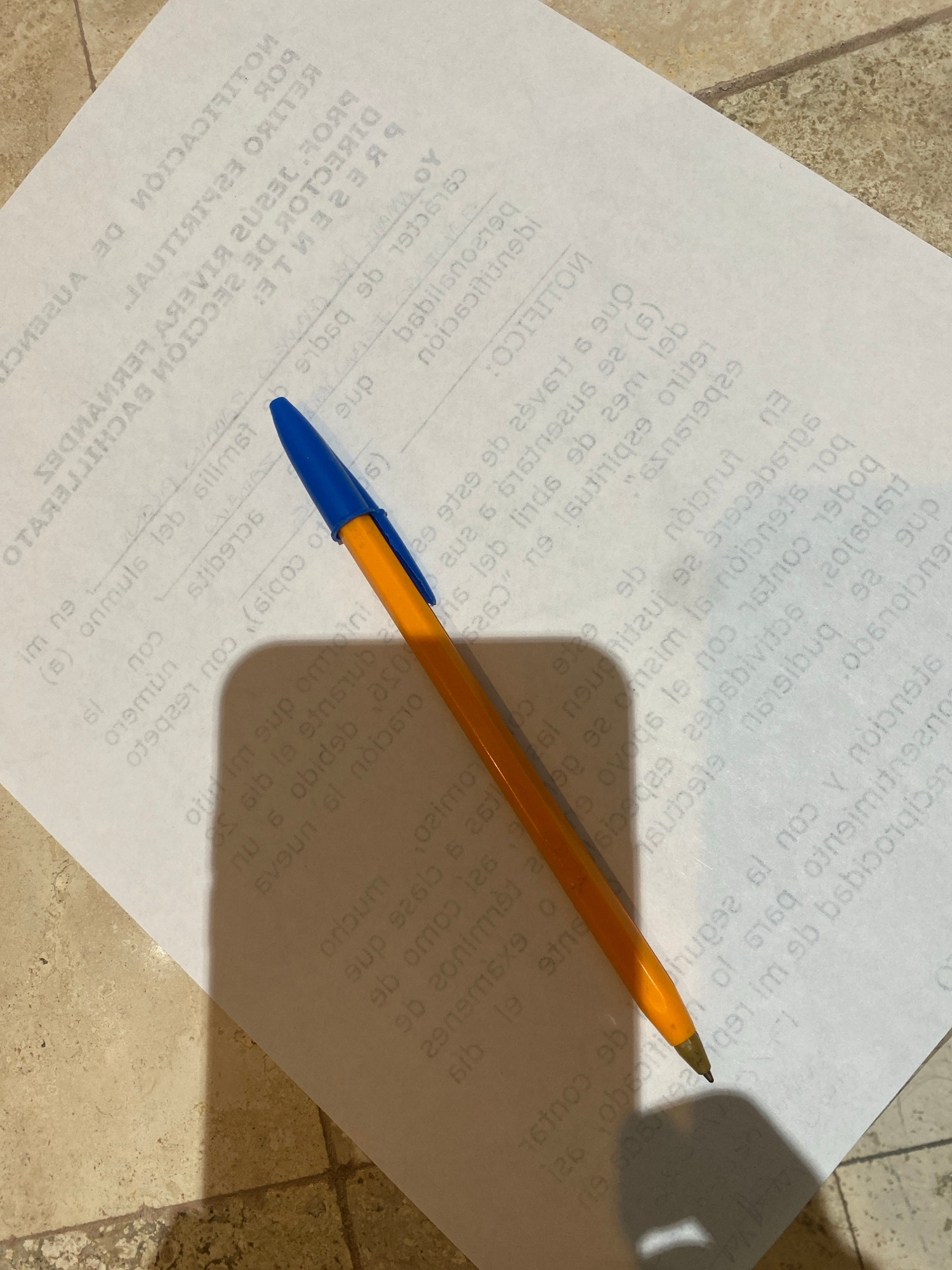 A white sheet of paper and an orange and blue ballpoint pen are resting on a light-colored, textured surface, possibly a tiled floor, in San Bernardino Tlaxcalancingo, Mexico. The paper is positioned…read more