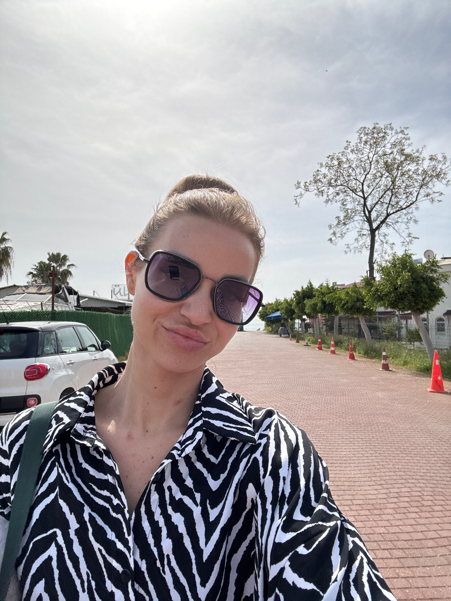 A close-up outdoor selfie depicts a woman, seen from the chest up, against a backdrop consistent with Erdemli, Turkey. She has light-colored hair pulled back and is wearing large, dark-lensed square sā¦read more