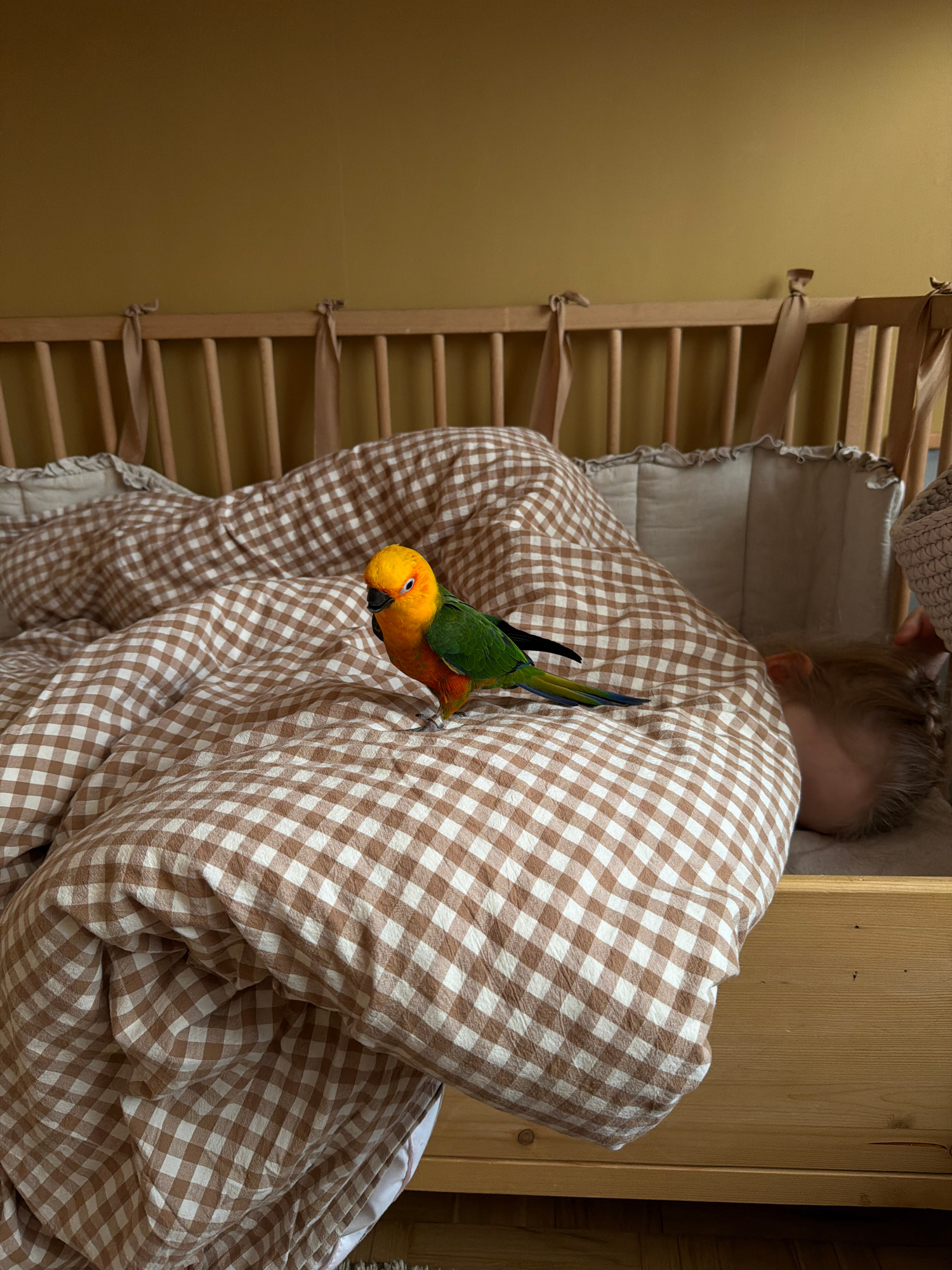 A child lies in a wooden crib covered with a brown and white checkered blanket. A sun conure parrot perches on the blanket near the child. The crib is positioned against a light yellow wall. A wooden…read more