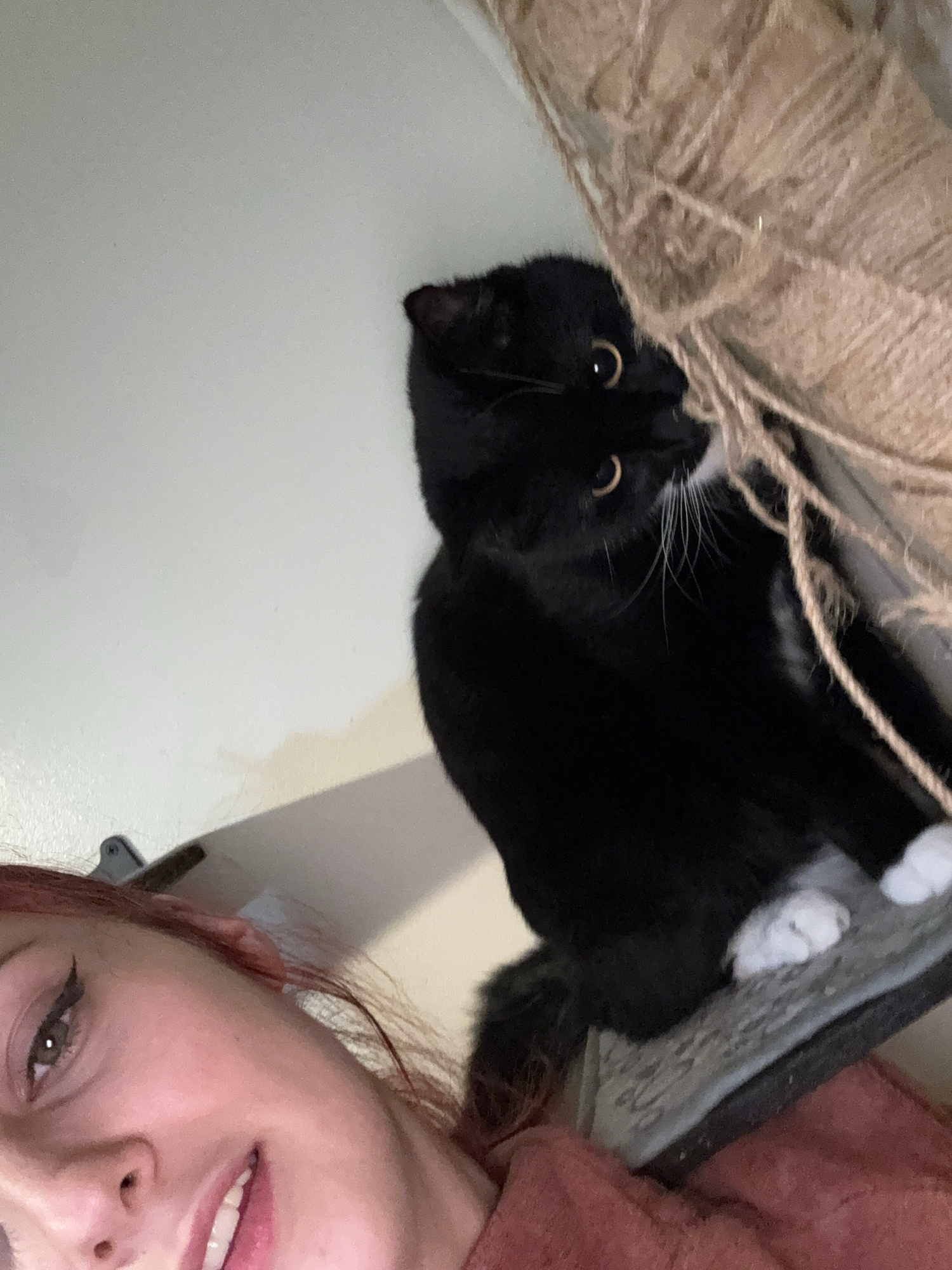 A rotated close-up indoor shot shows a woman and a tuxedo cat. The woman is on the right side of the frame with her face partially visible, including her eye, nose, mouth, and hair. She has red hair a…read more