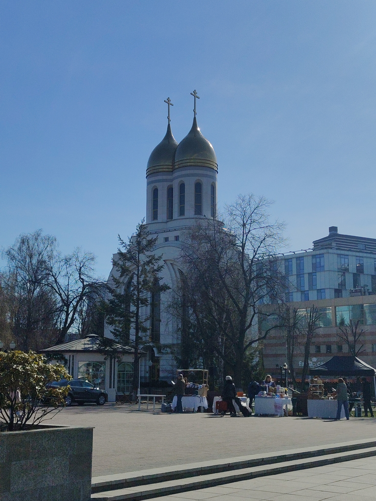 The image depicts a scene in a public space, likely a square, in the city of Unknown, Unknown. Dominating the background is a large Orthodox church with twin golden domes topped with crosses. The churβ¦read more