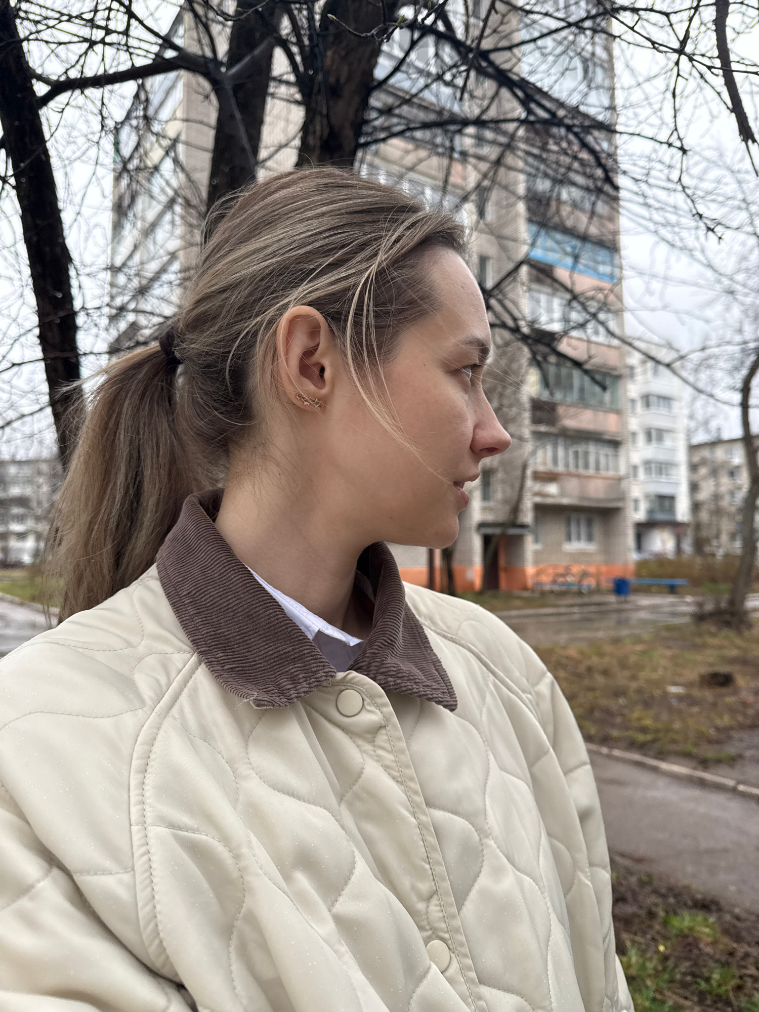 A profile view of a fair-skinned woman in her late 20s or early 30s, standing outdoors. She has light brown hair pulled back into a low ponytail. The woman is looking upward with a slightly open mouth…read more