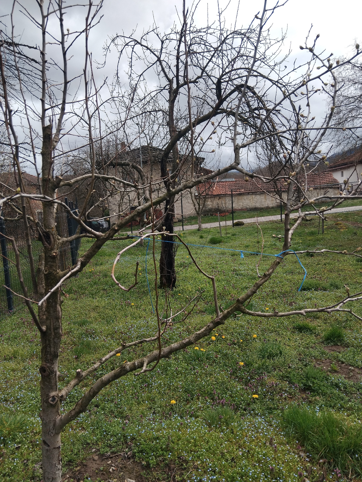 The image depicts a springtime scene, likely in the city of Apriltsi, Bulgaria, featuring two fruit trees in the foreground. The trees have bare branches with swelling buds, suggesting the onset of sp…read more