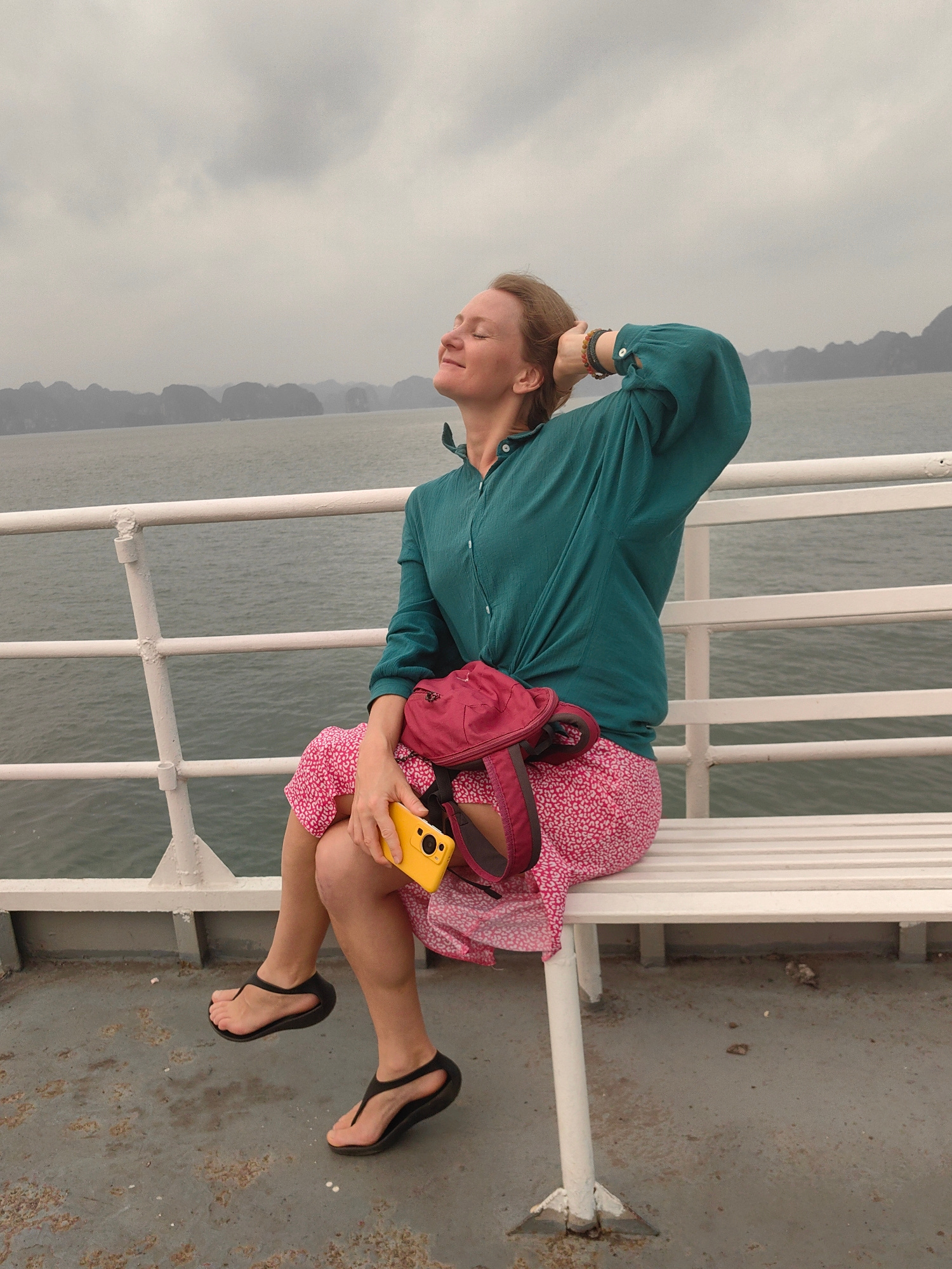 A woman sits on a white bench on a boat. She wears a teal long-sleeved shirt, a pink patterned skirt, and black sandals. She is holding a yellow smartphone in her right hand and has a red fanny pack o…read more