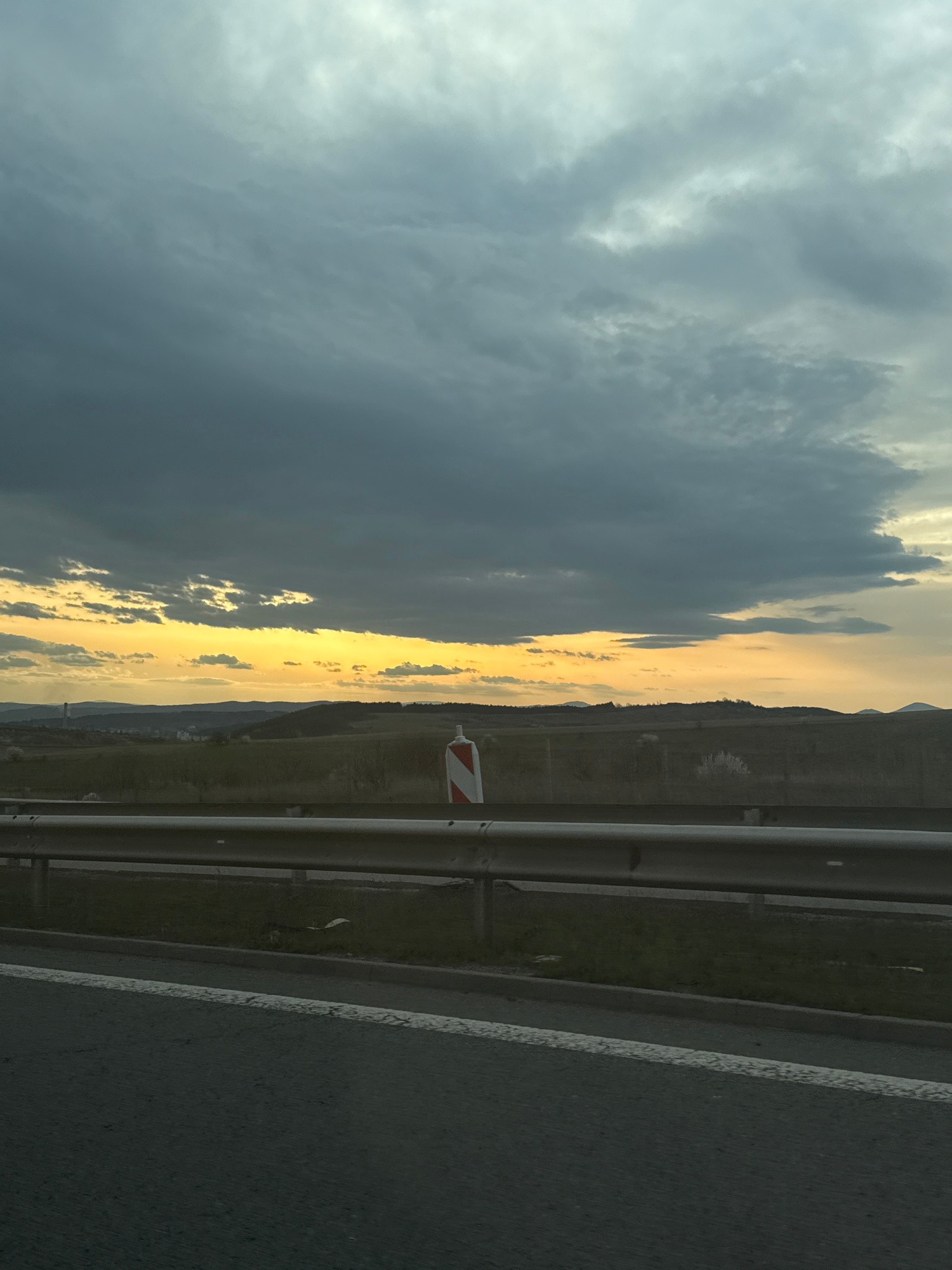 The image depicts a view from a vehicle traveling on a road, likely a highway, in Pernik, Bulgaria. The road is to the right, with a white line marking the edge. A metal guardrail runs parallel to the…read more