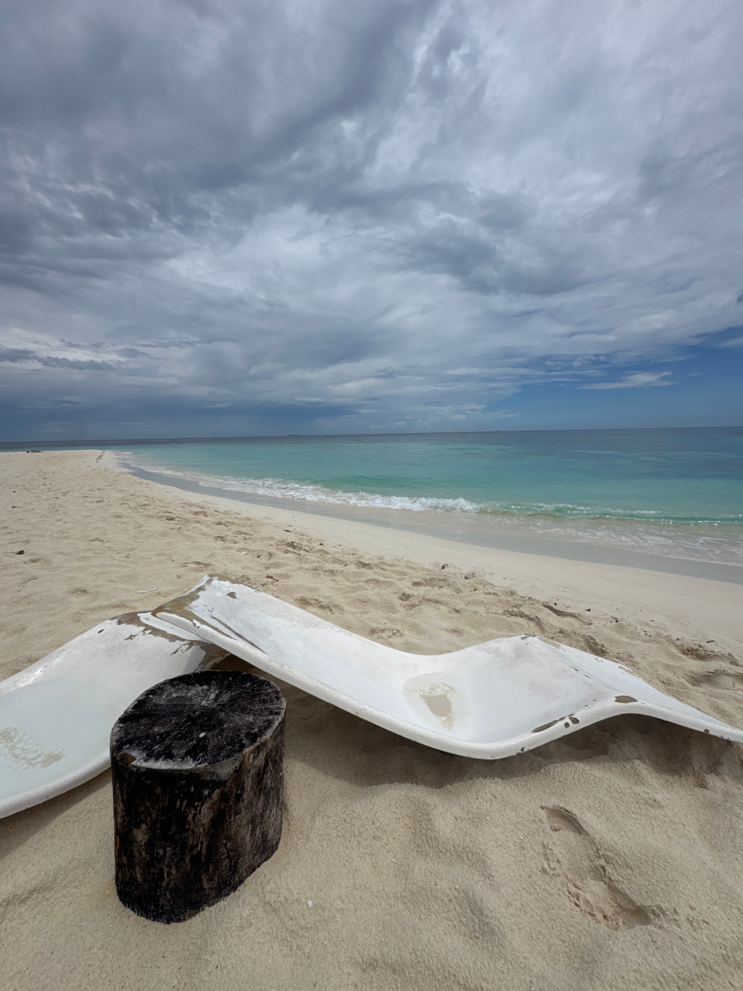 The image depicts a section of a beach in Ukulhas, Maldives. The beach has light-colored sand with a discarded piece of white plastic and a section of driftwood in the foreground. A footprint is visib…read more