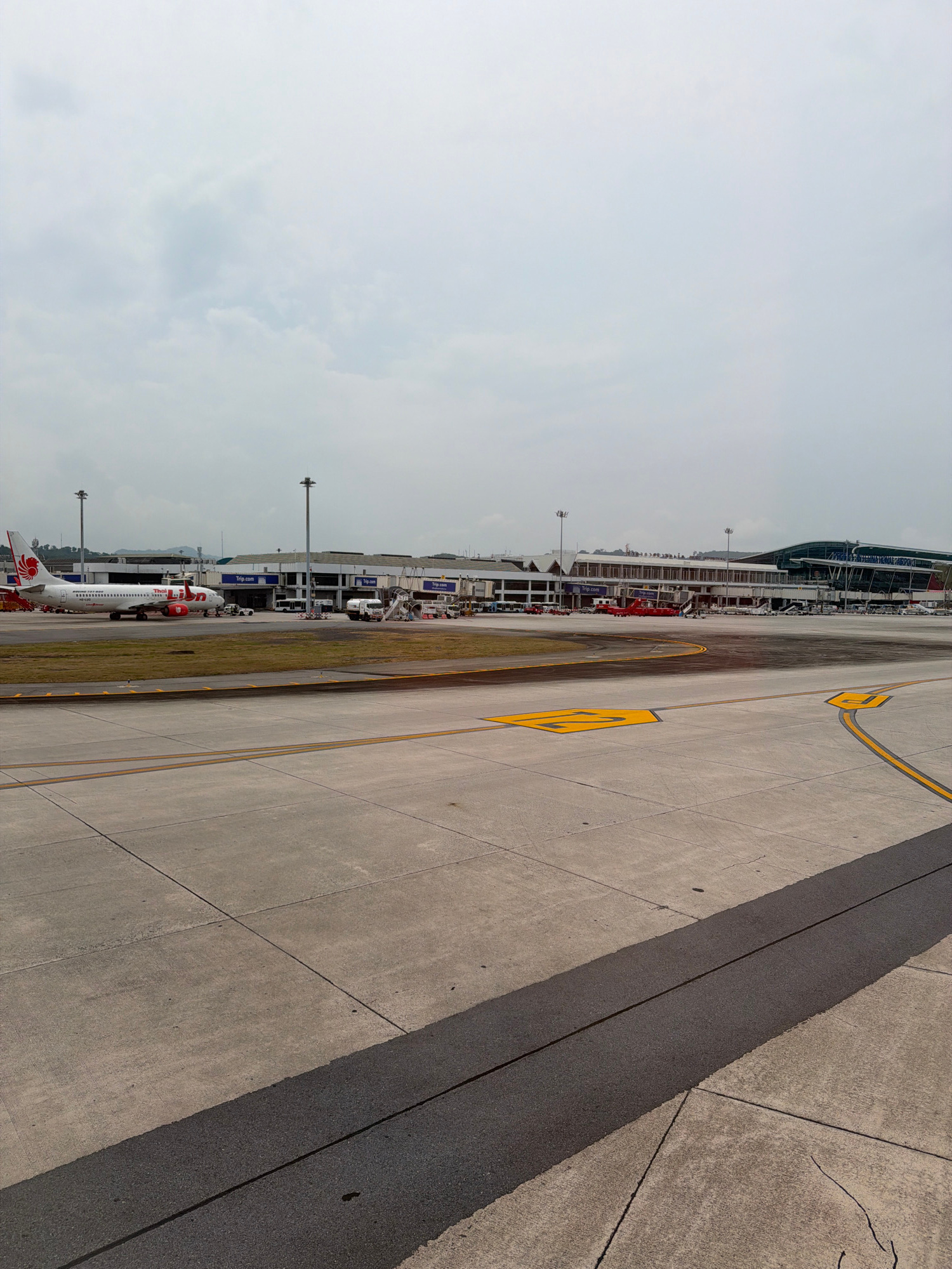 This is an outdoor shot of an airport setting in Tambon Mai Khao, Thailand. An airplane is parked next to a terminal building that features "Trip.com" signage. The airport's concrete tarmac is promine…read more