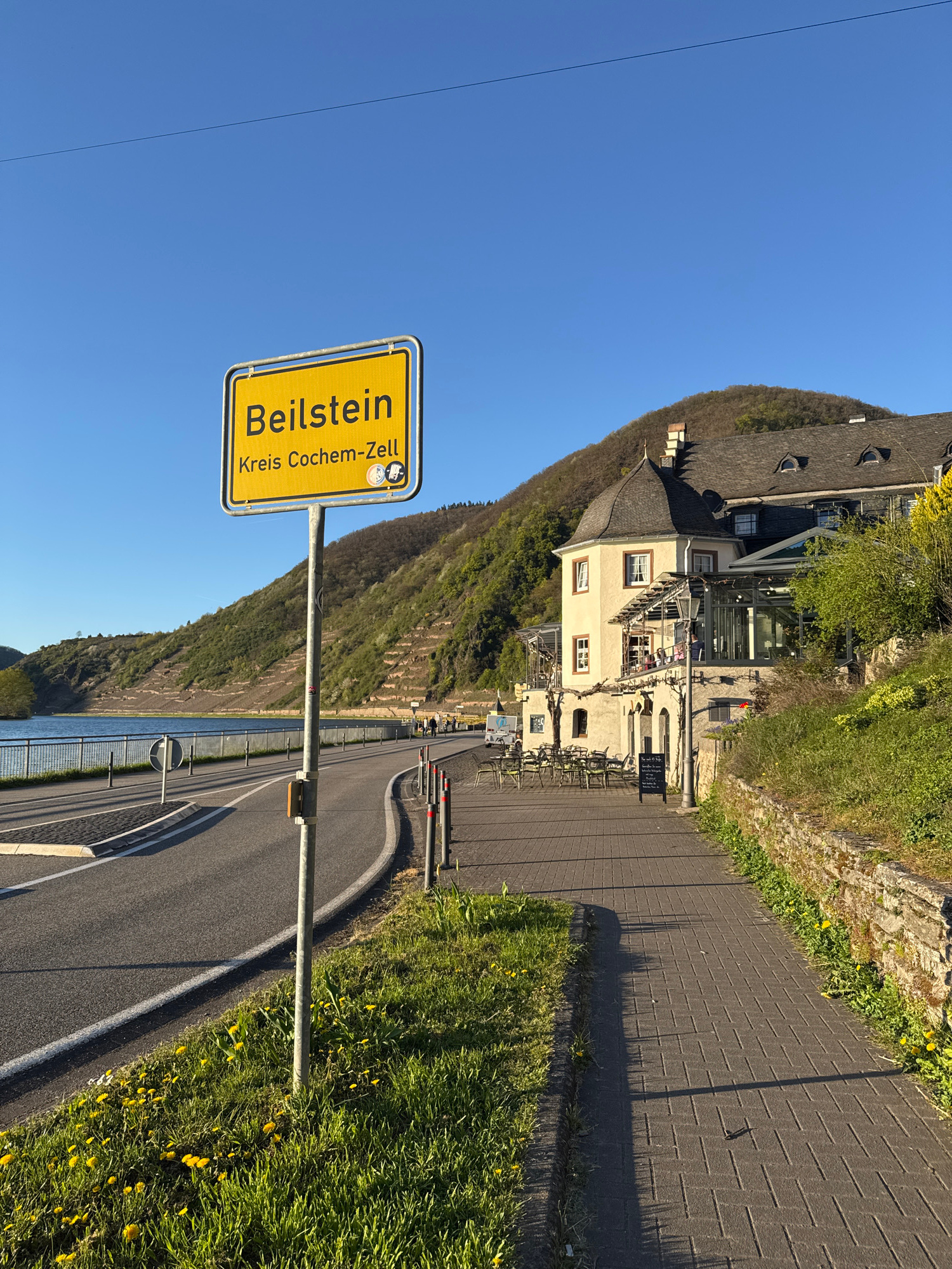 The image captures a roadside scene in Beilstein, Germany. A yellow signpost with "Beilstein Kreis Cochem-Zell" is prominently displayed against a clear blue sky. A road curves along the riverbank wit…read more