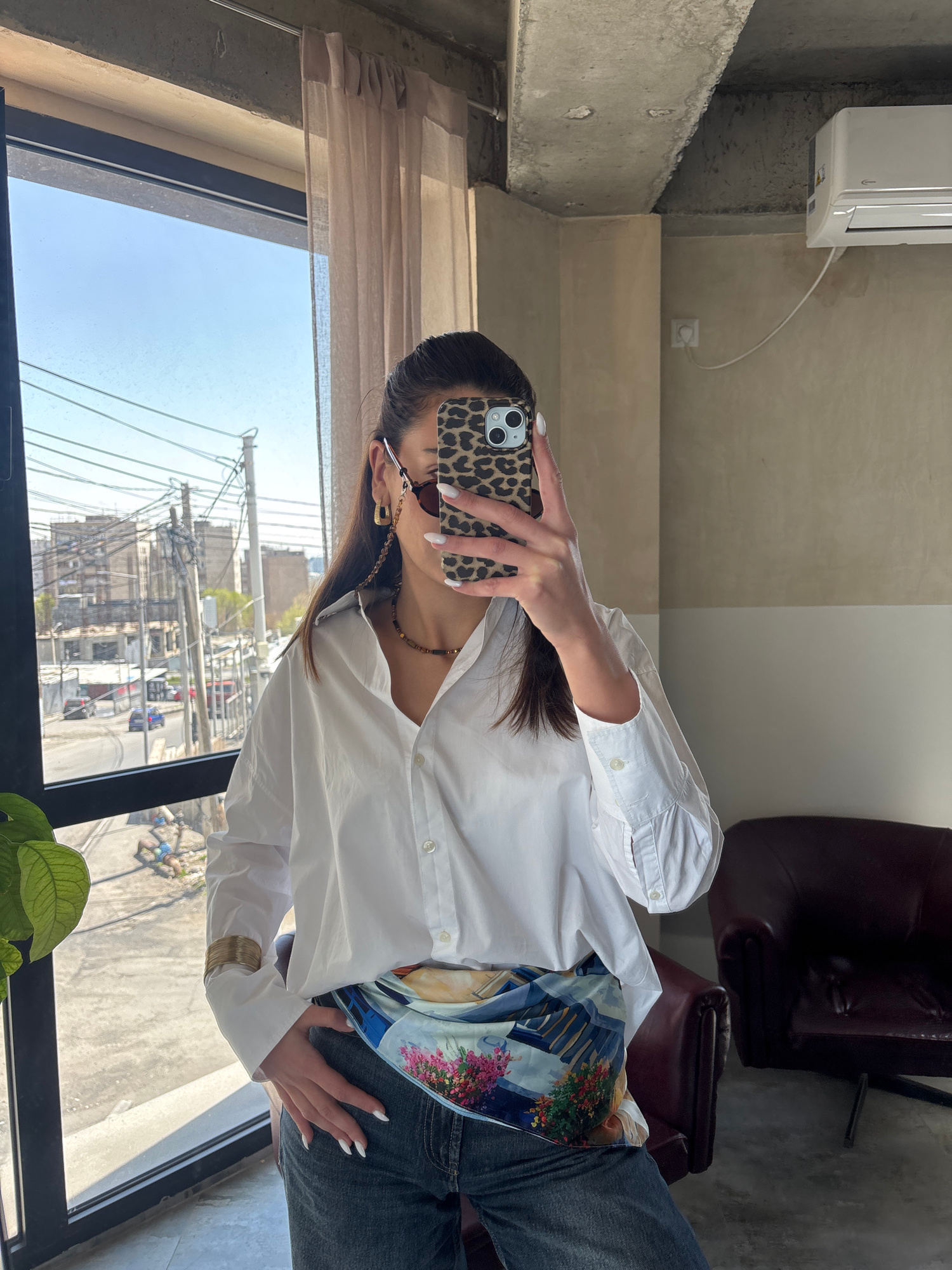 A person is capturing a mirror selfie indoors, holding a leopard-print smartphone that largely obscures their face. They are wearing a white long-sleeved button-up shirt, dark blue jeans, and a colorf…read more