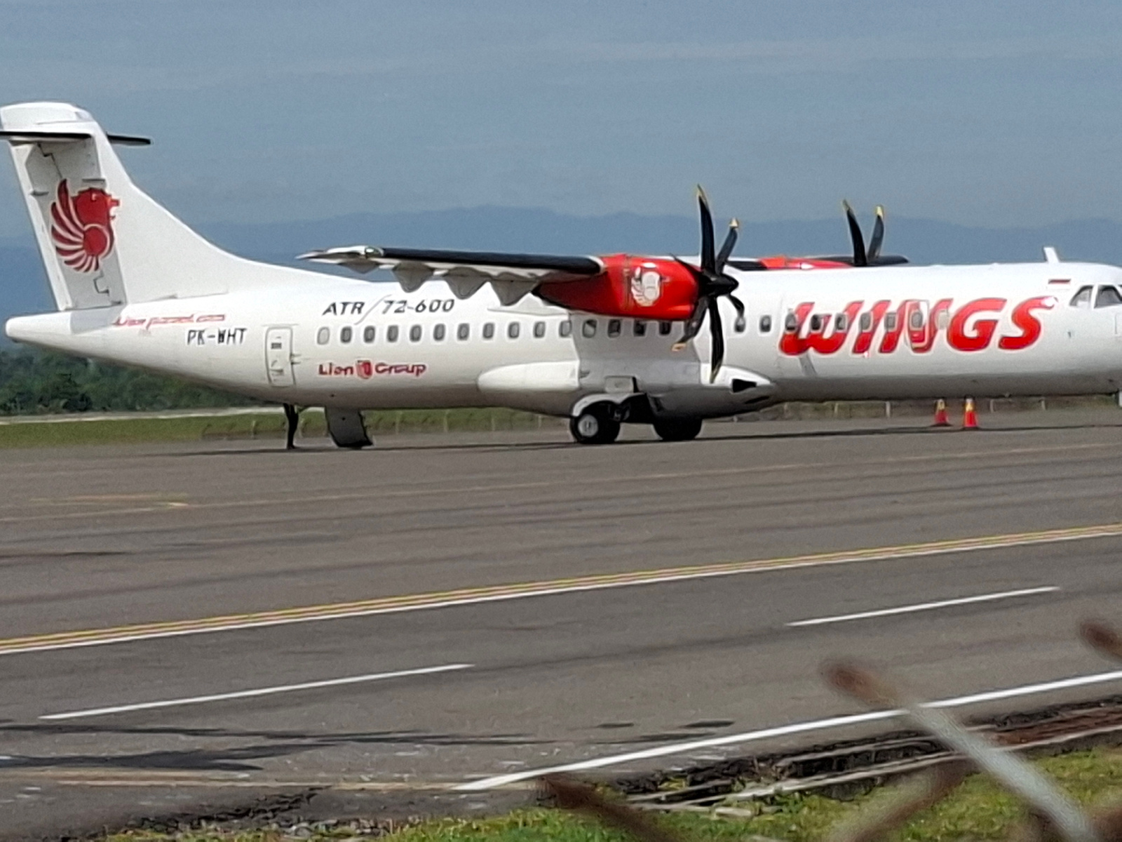 The image depicts a Wings Air ATR 72-600 aircraft on an airfield in Panigah, Indonesia. The plane is painted white with a red logo and the word "Wings" in red lettering along the fuselage. It bears th…read more