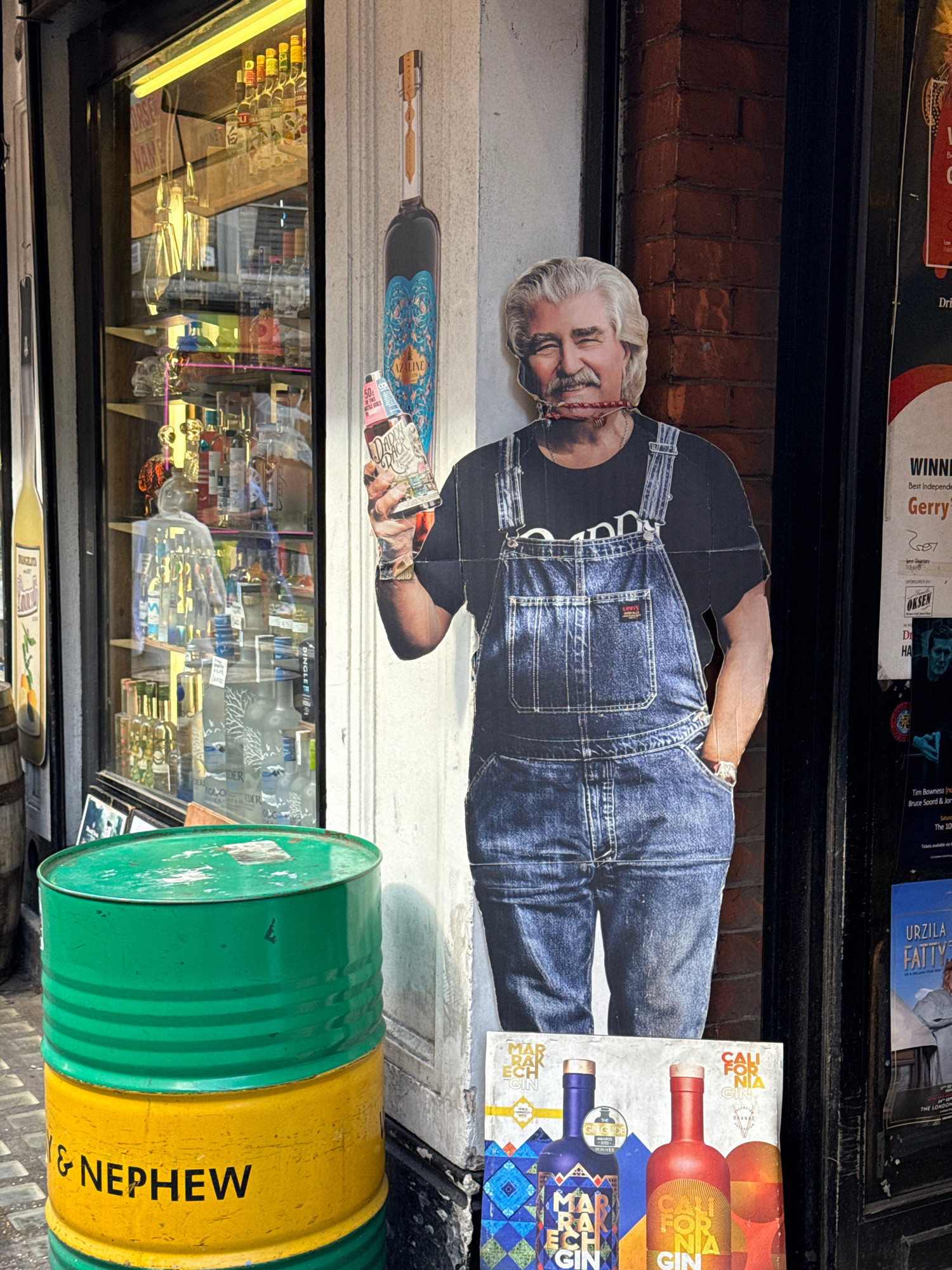 The media file, oriented sideways due to a 90-degree clockwise rotation, depicts a vibrant daytime street scene in London, United Kingdom. The focus is the exterior of a shop, likely a liquor store orβ¦read more