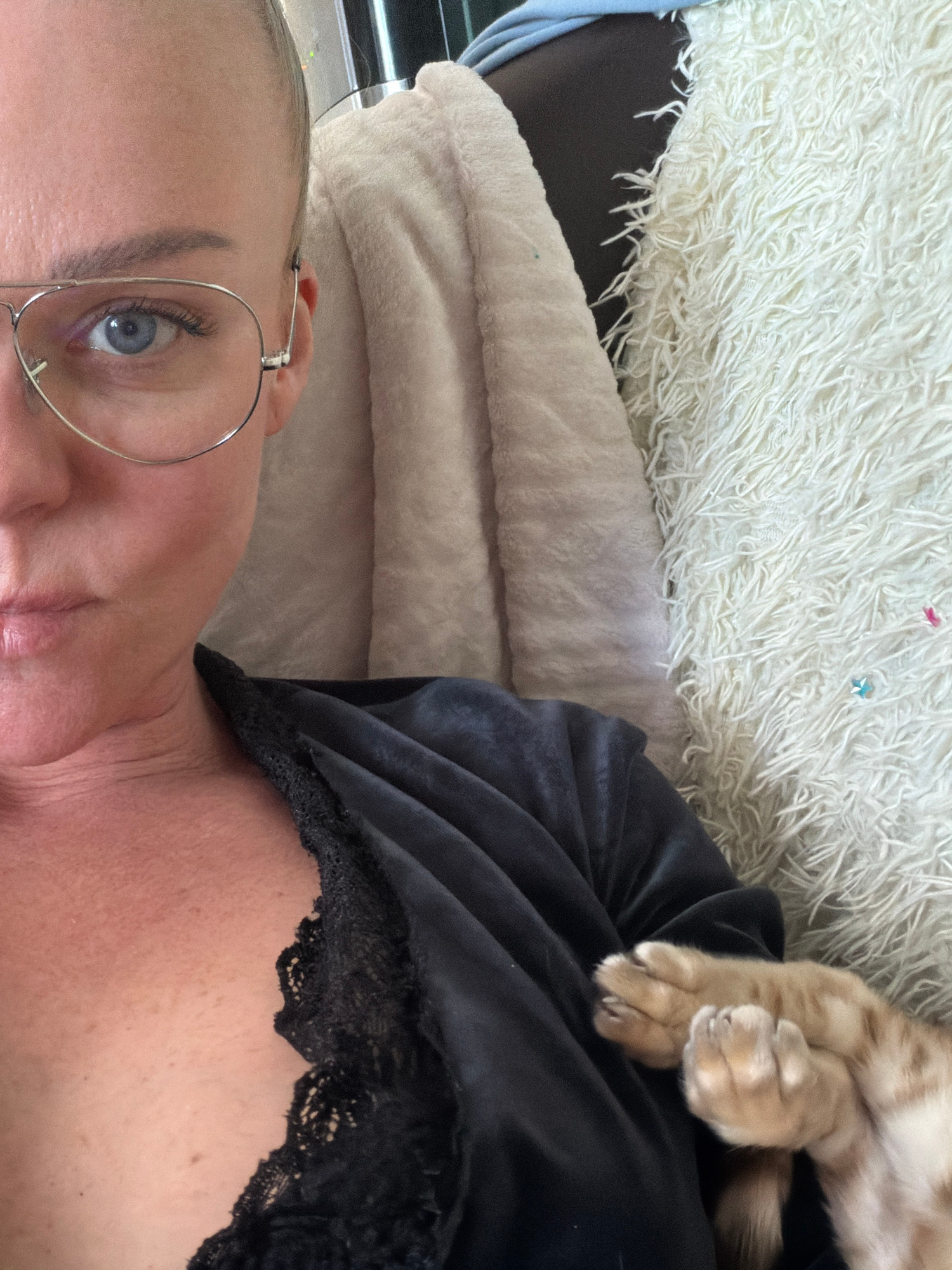 A low-angle, close-up shot depicts a person, likely female, lying down. Part of their face, specifically the eye with silver-rimmed glasses, nose, and part of the mouth, is visible. They have fair ski…read more
