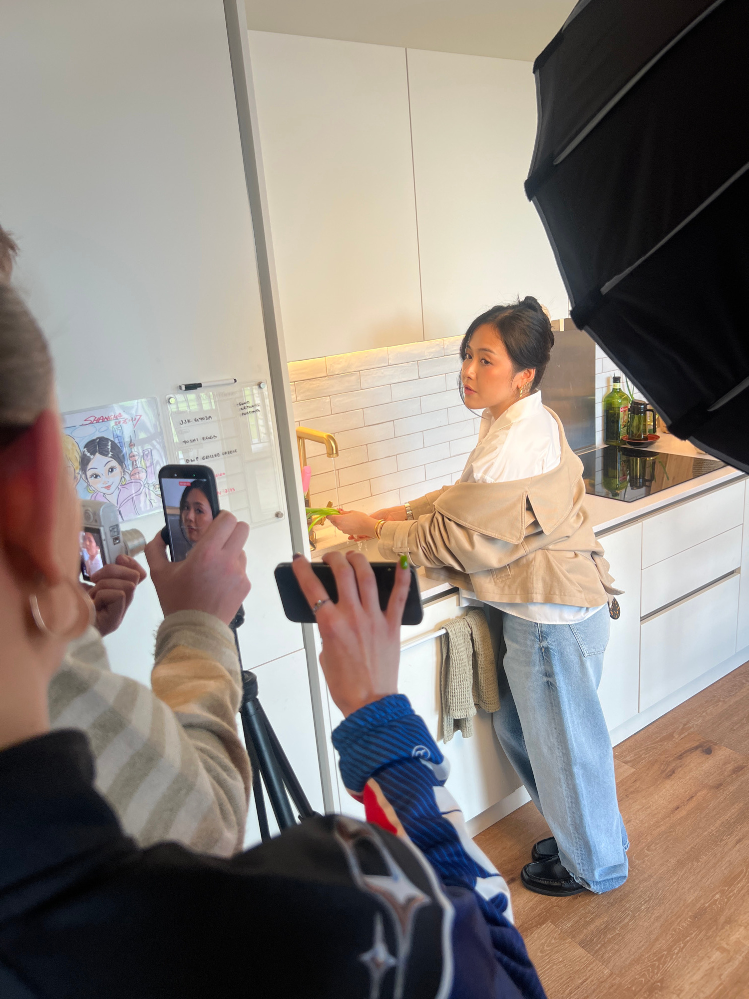 A woman is bending over a kitchen sink, possibly washing dishes, as two people photograph her with smartphones. She is wearing a white shirt, a light tan jacket, and light blue jeans, and black loafer…read more