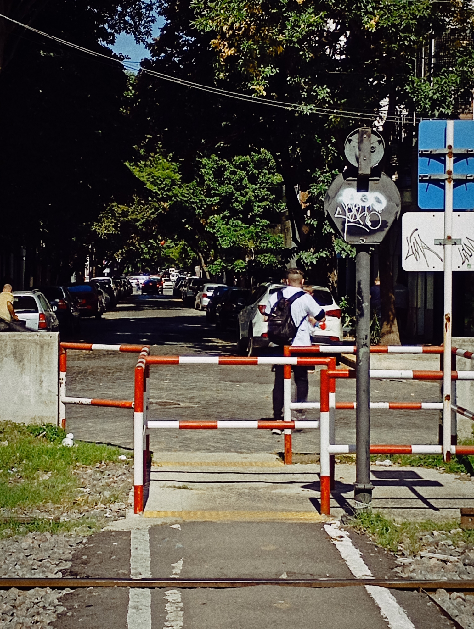 The image shows a street view at a railroad crossing in Buenos Aires, Argentina. The foreground is dominated by a railroad track with a white stripe painted between the rails. A pedestrian crossing is…read more