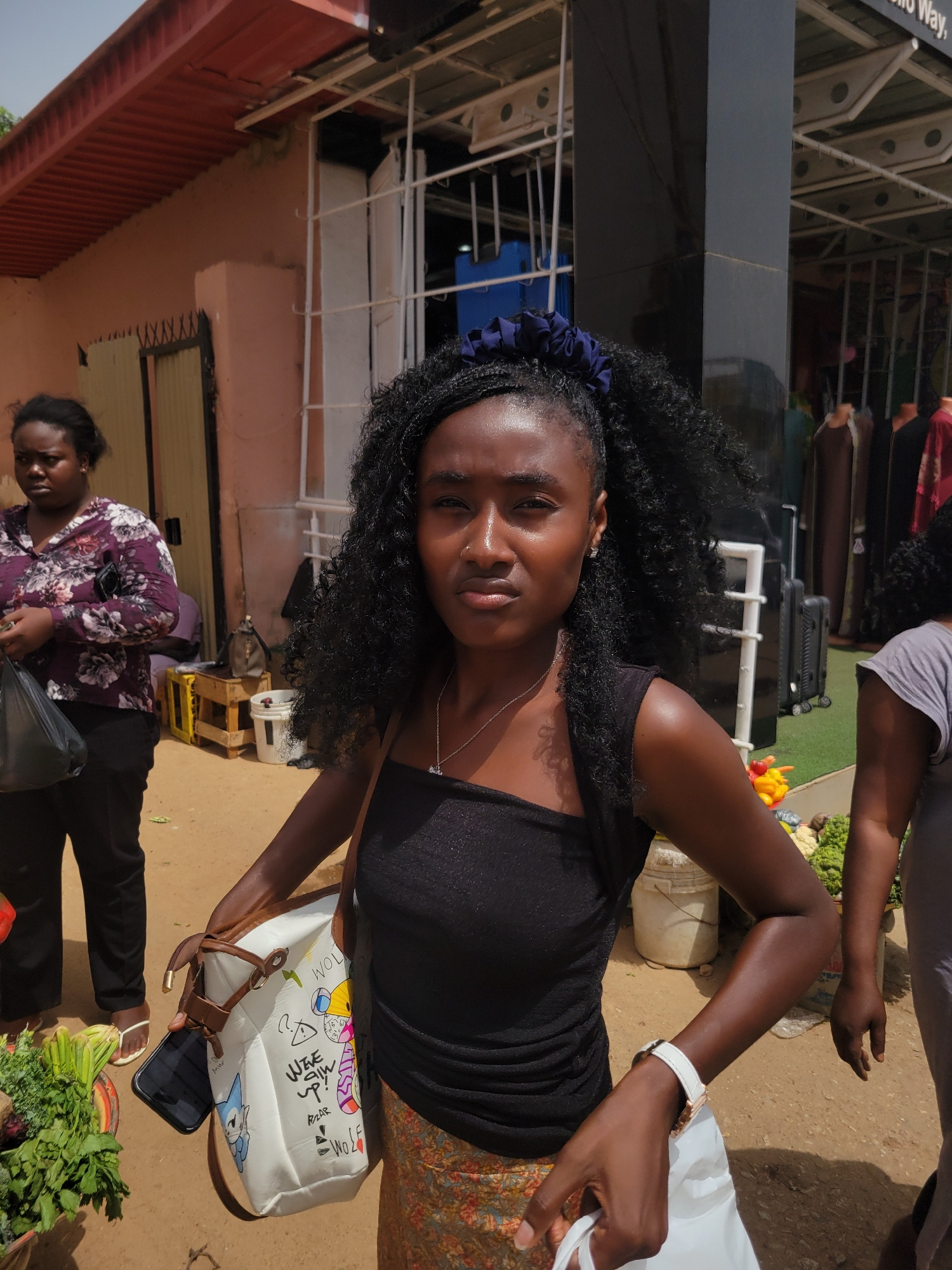 The image depicts a young Black woman, likely in her early to mid-twenties, standing in what appears to be an outdoor market or commercial area. The background features parts of buildings, possibly sh…read more