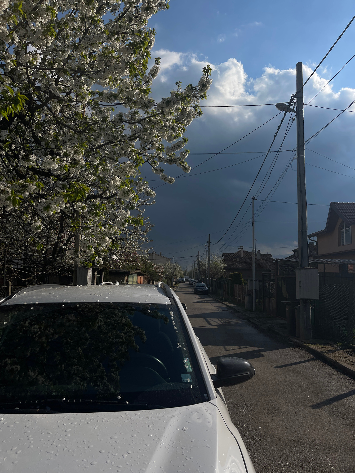 The image displays a street scene in Sofia, Bulgaria, under dramatically contrasting weather conditions during the daytime. On the left side of the foreground, a large tree is in full bloom, densely c…read more