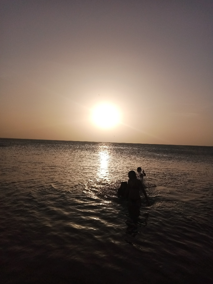 The image captures a sunset over a body of water in Juan Griego, Venezuela. The bright, circular sun is positioned low on the horizon, slightly left of center, emitting a strong glare and casting a pr…read more