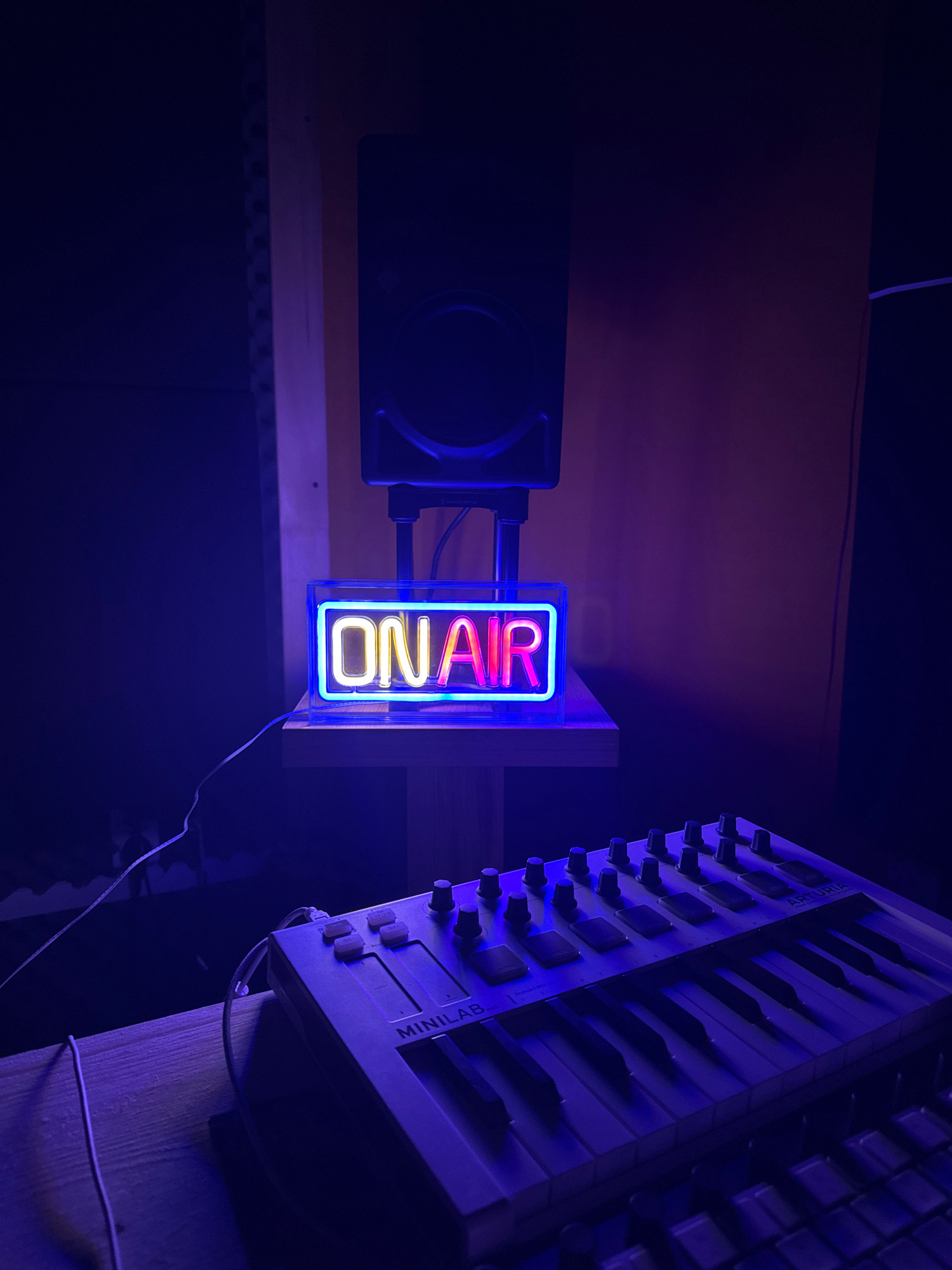 A low-angle, medium shot indoors shows a blue and red "ON AIR" sign, a black speaker, and a keyboard, possibly a MIDI keyboard, attached to a wooden surface. The environment appears dark with blue ligβ¦read more