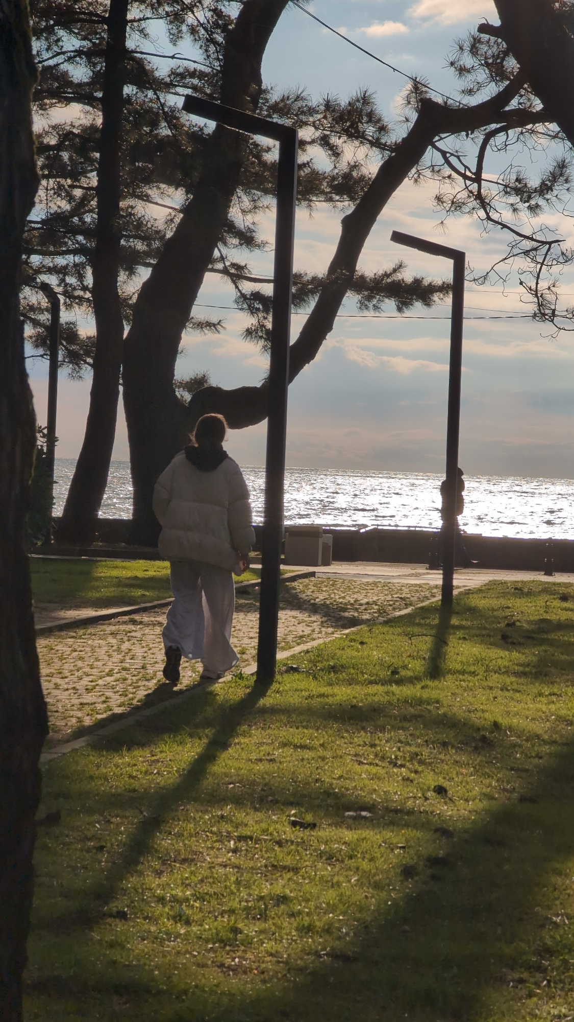 The image captures a scene in Kobuleti, Georgia, where a person is standing near a set of metal frames positioned beside a tree, with the Black Sea visible in the background. The person, wearing a whi…read more