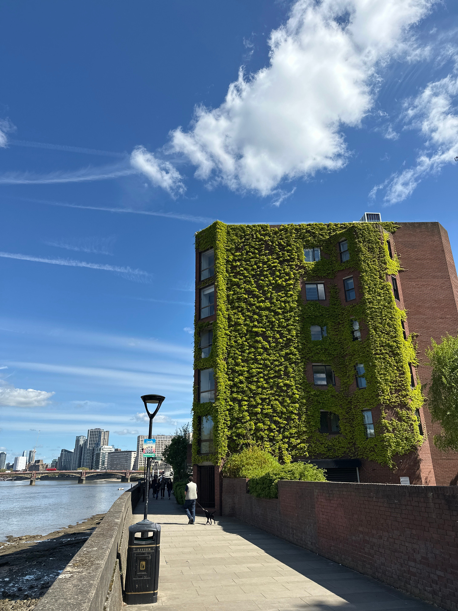 The image shows a building covered in ivy located in London, United Kingdom, adjacent to a riverside walkway. The building has multiple windows visible through the ivy. The sky above is blue with stre…read more