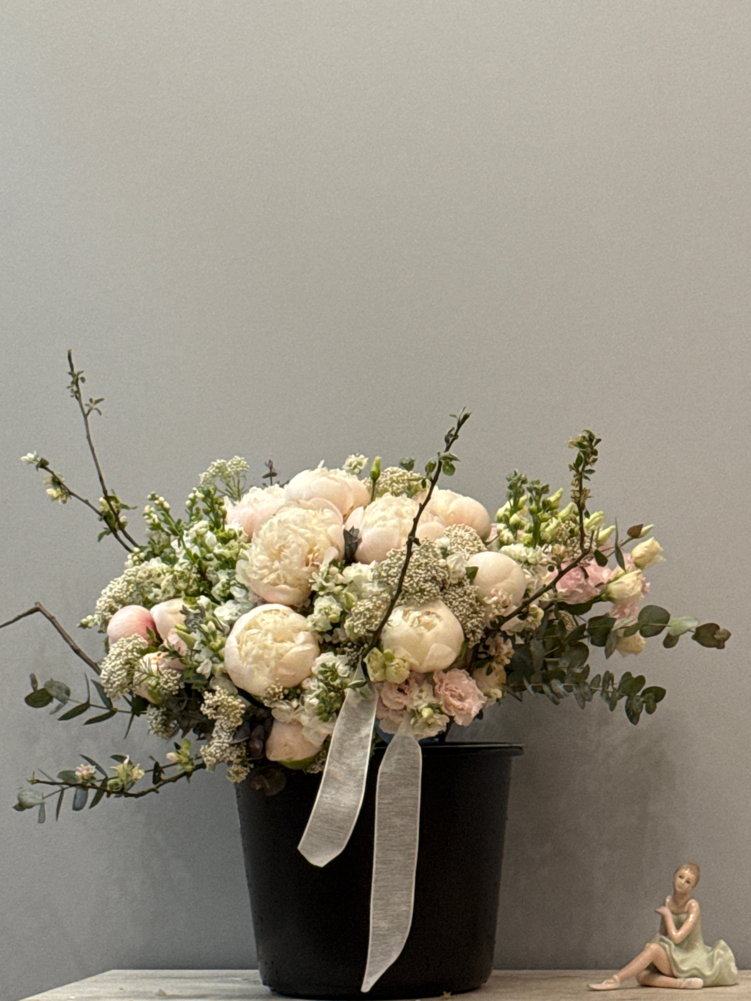 The image depicts a bouquet of flowers arranged in a black vase. The flowers are primarily white and pink, consisting of peonies, roses, and greenery such as eucalyptus. A light-colored ribbon is tied…read more