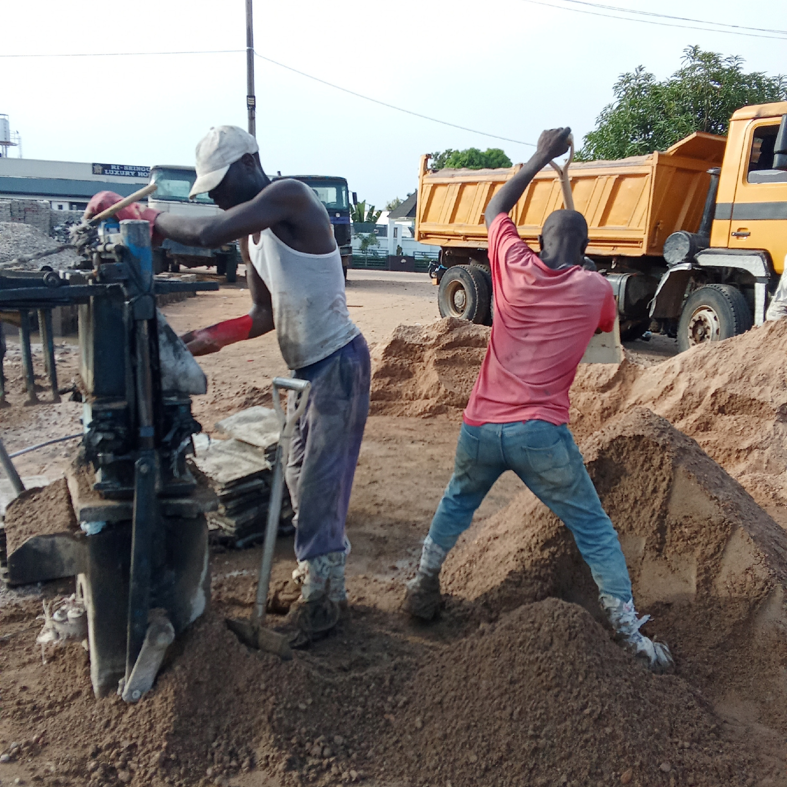 This full-shot image captures an outdoor manual labor scene, likely at a construction material production site in Akwanga, Nigeria. Two men are engaged in strenuous work involving piles of reddish-broβ¦read more