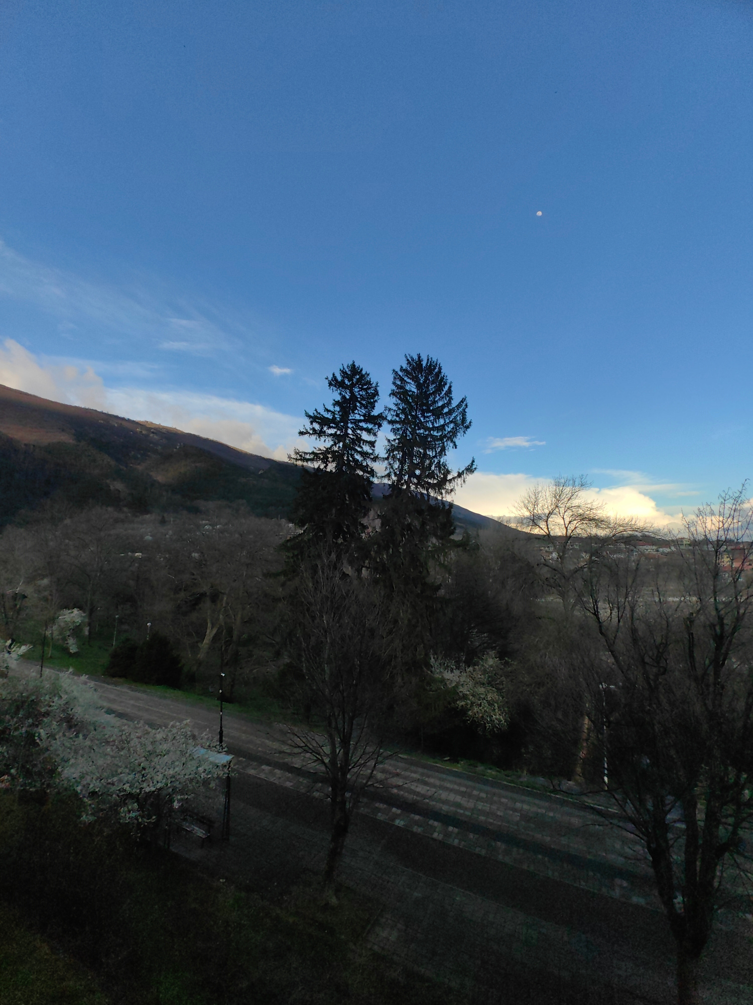 The image presents a landscape view at dawn or dusk, showing two prominent coniferous trees in the center of the frame. The trees stand on a slope overlooking a path or road below. The lower part of t…read more