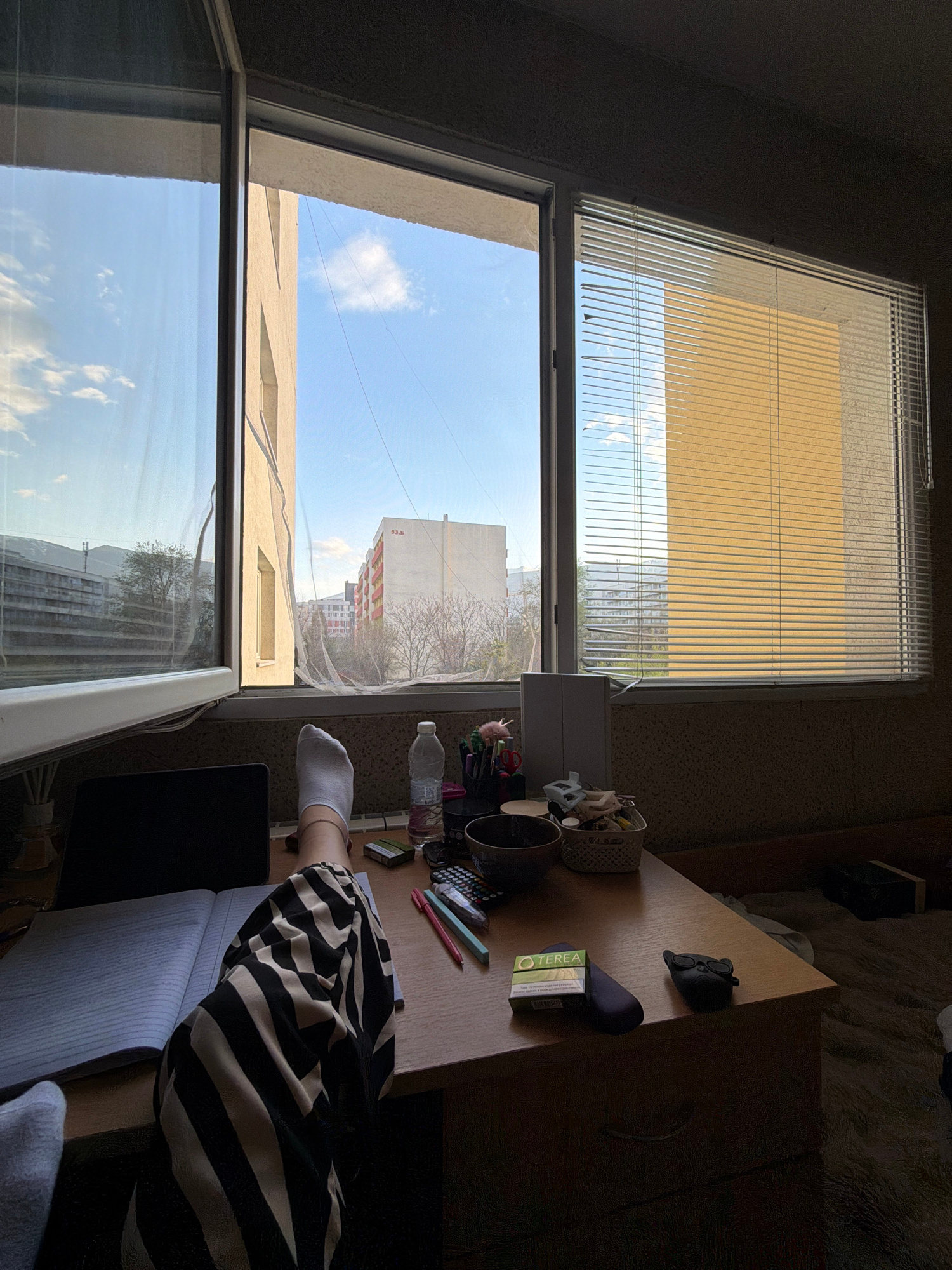 The image depicts an indoor scene, possibly an apartment, with a view through a large window overlooking a cityscape. A partially closed Venetian blind covers the top part of the window. Below the bli…read more