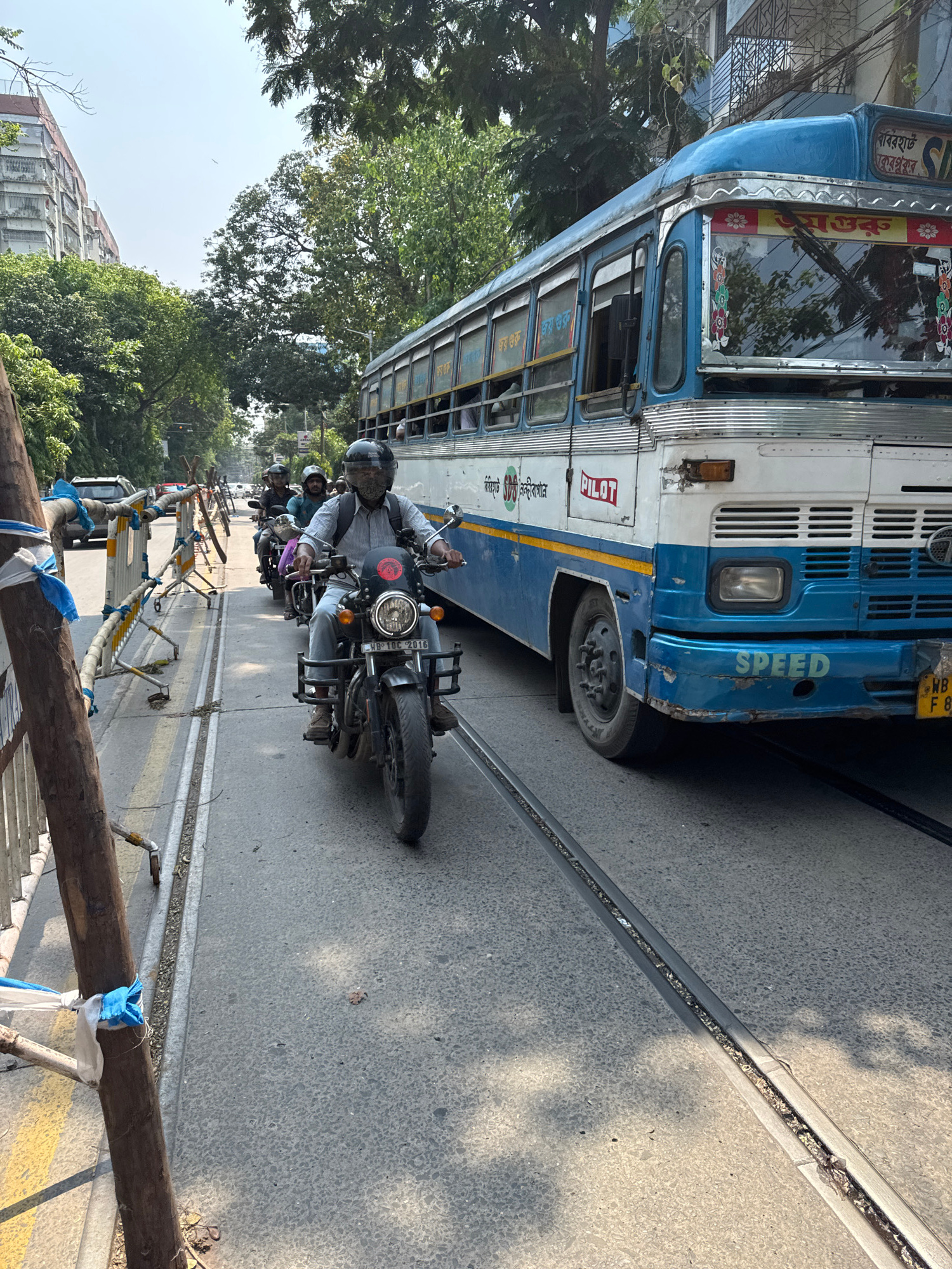 The image depicts a street scene in Kolkata, India. A blue and white public transit bus, with the word "SPEED" painted on its front, is partially visible on the right side of the frame, its front tire…read more