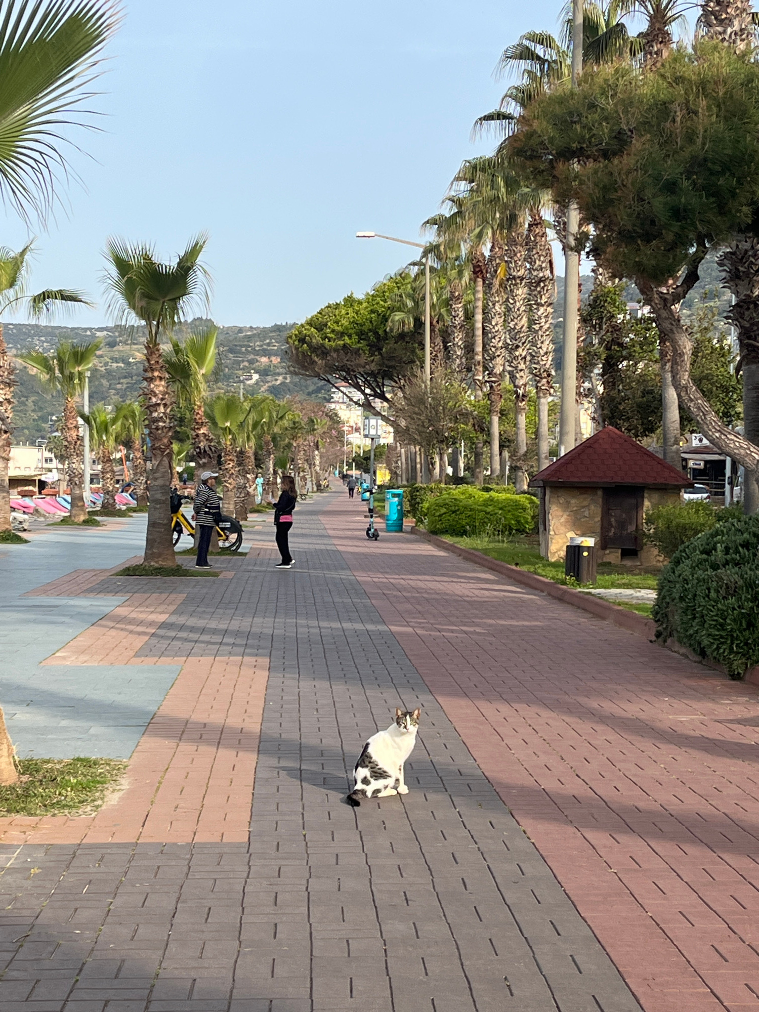 A seaside scene in Alanya, Turkey, shows a walkway paved with gray and red bricks along the beach. A white cat with black spots sits on the walkway. A person is bending over, stretching or exercising.…read more