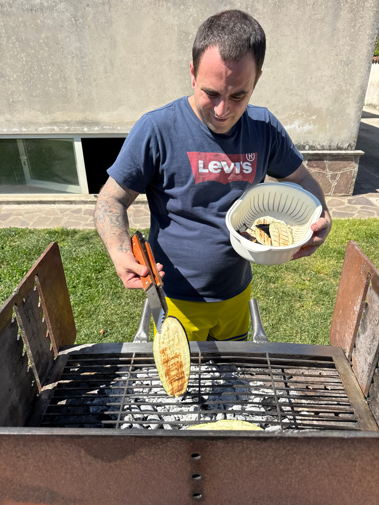 A man is grilling sliced eggplant on a charcoal grill outdoors. He is wearing a blue Levi's T-shirt and yellow shorts. He's using tongs to place the eggplant from a white colander onto the grill. The…read more