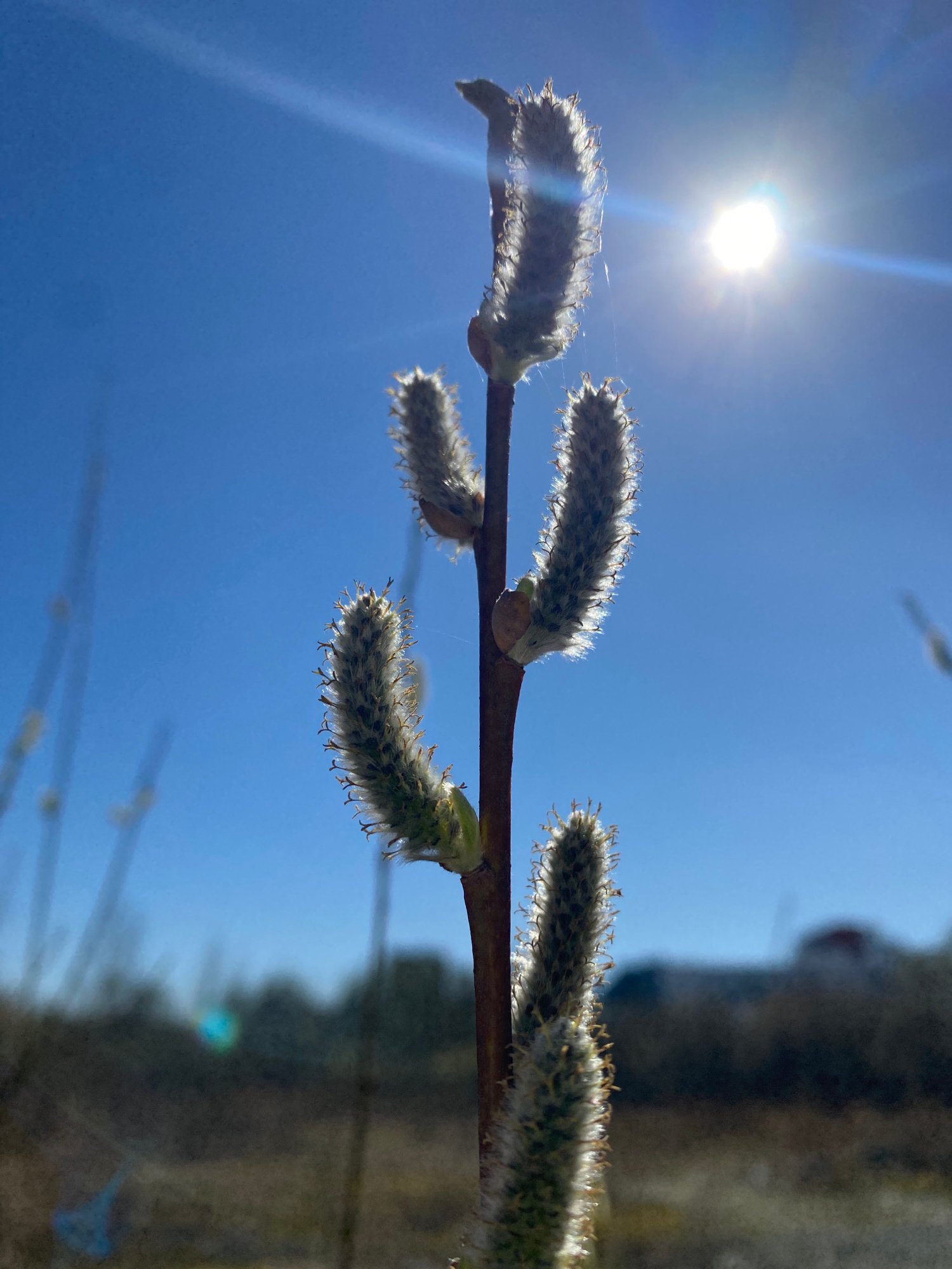 A close-up shot, taken from below, shows a branch of a pussy willow against a clear blue sky with the sun shining brightly. The branch extends horizontally across the frame, holding four distinct catkβ¦read more