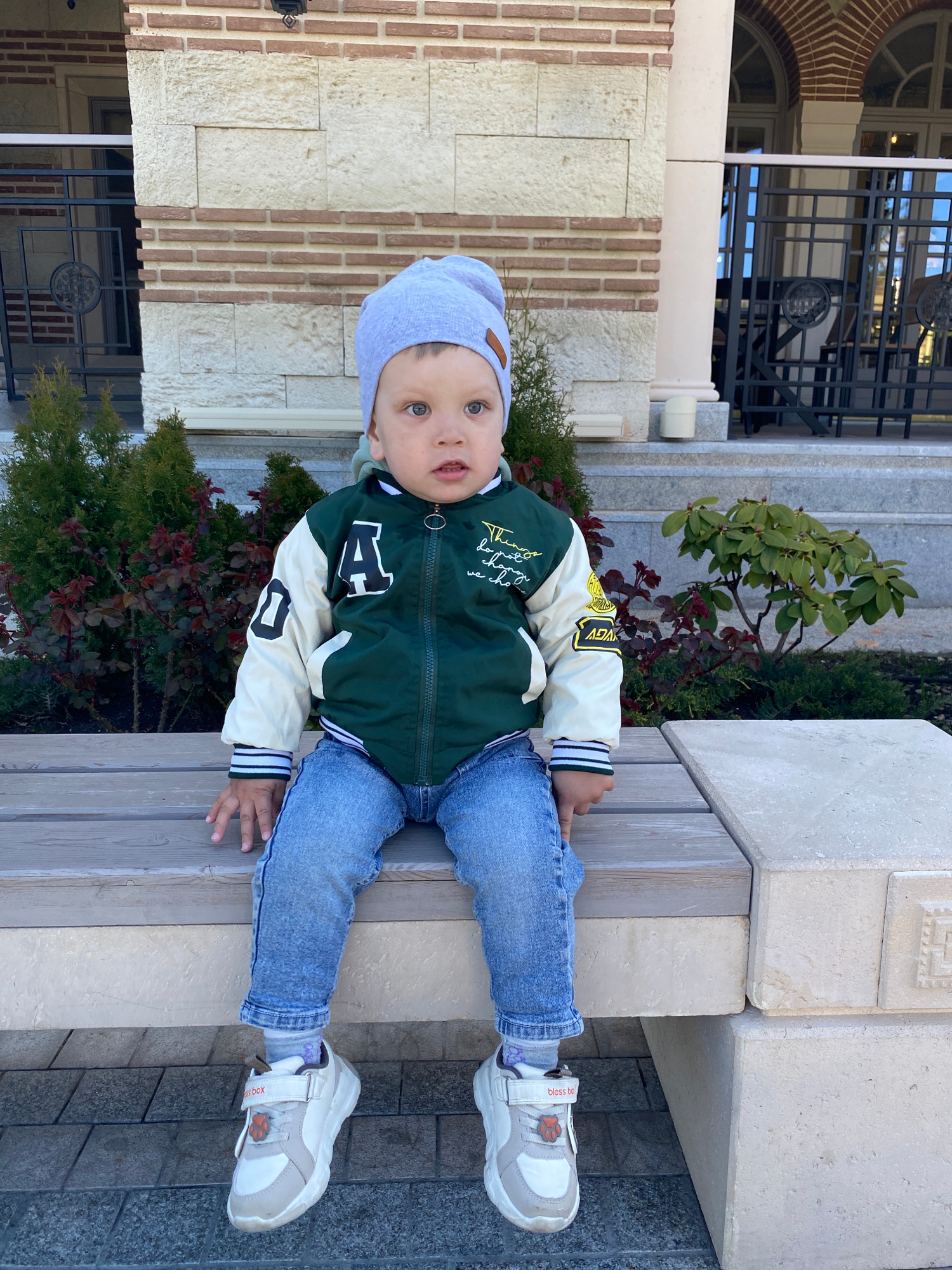 A young child, appearing to be a toddler, is seated on a wooden bench outdoors in Sevastopol, Ukraine. The child is dressed in a light grey beanie, a green and cream-colored varsity-style jacket, blue…read more