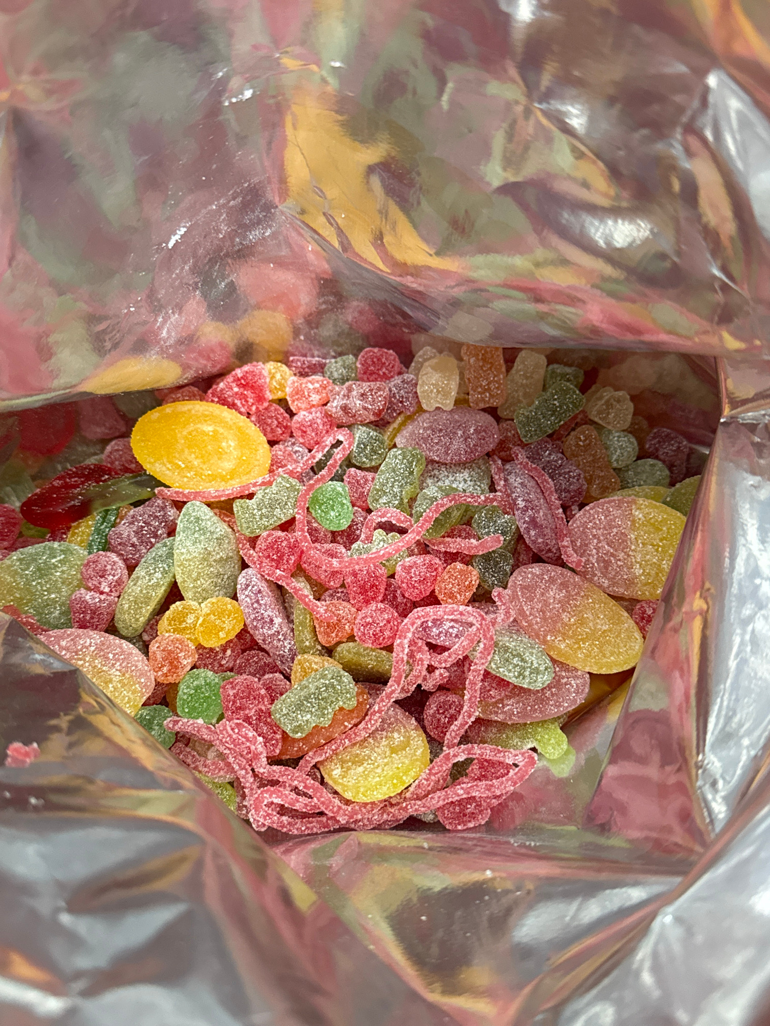 The image shows a bag of gummy candies. The bag is made of a crinkled, reflective silver material. The candies are of various shapes and colors, including yellow, green, red, and purple. They appear t…read more