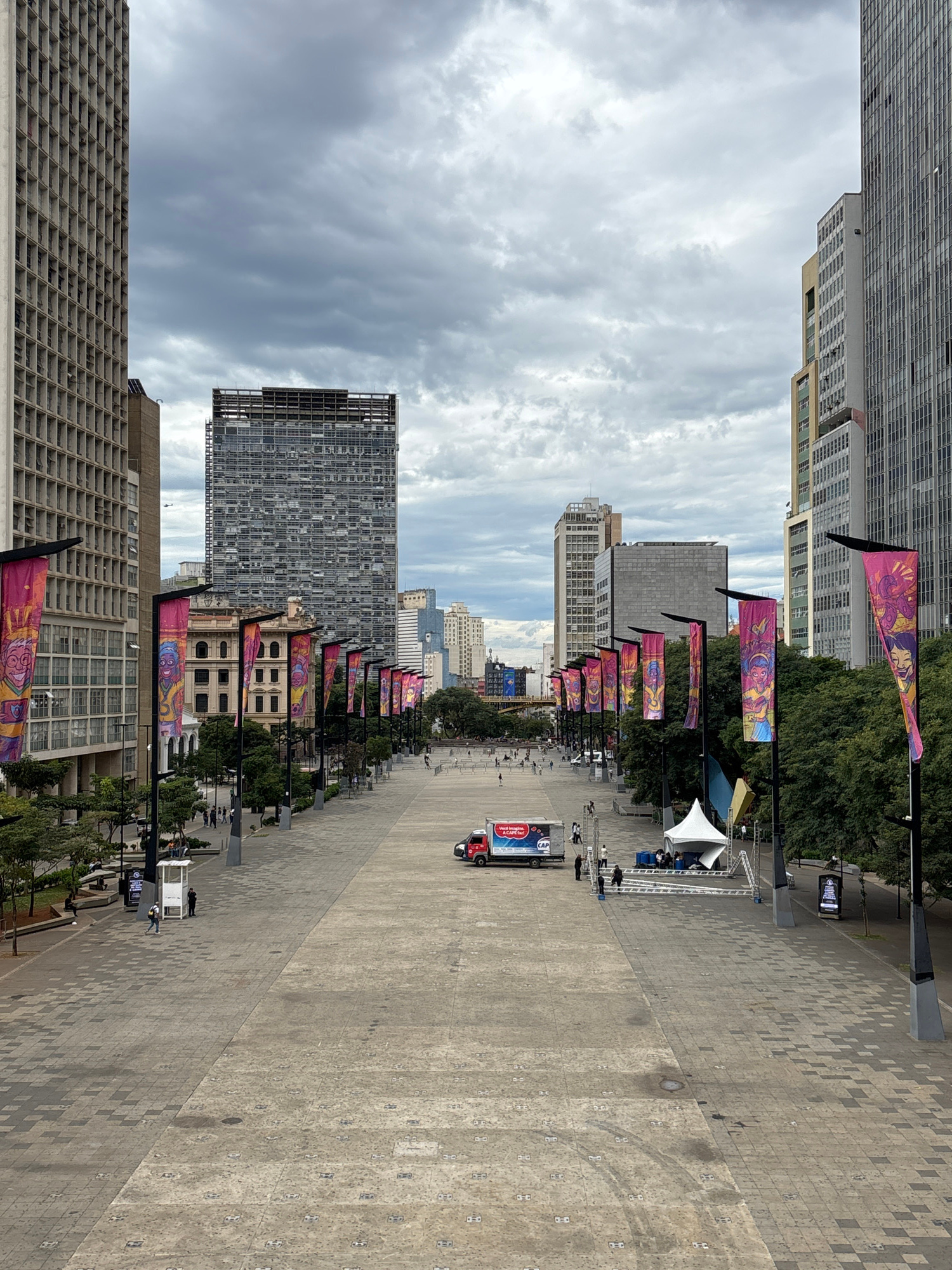 The image captures a wide pedestrian walkway in São Paulo, Brazil, lined with lamp posts featuring colorful banners. High-rise buildings flank both sides of the walkway, some under construction, and a…read more