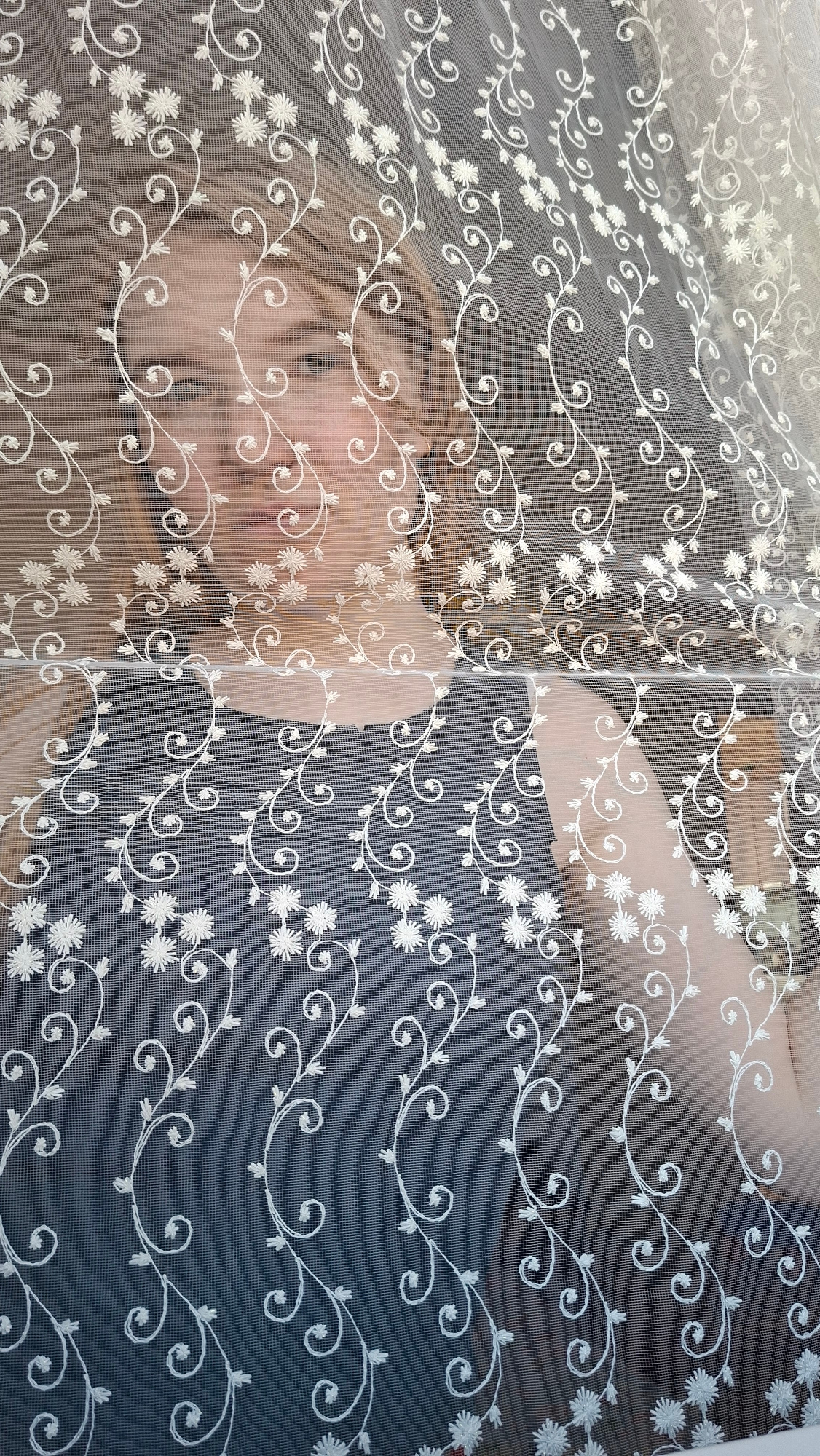 A person with light skin and light brown hair is visible behind a sheer white curtain with an embroidered floral and vine pattern. The person's face, particularly the nose and mouth, is somewhat obscu…read more