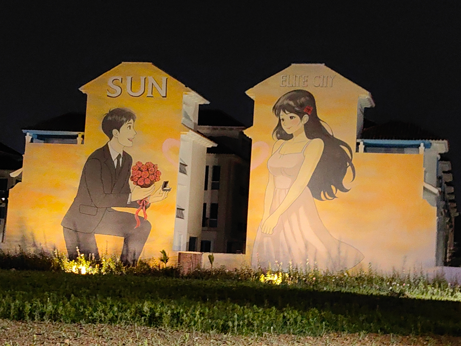 A nighttime shot depicts a mural painted on two adjacent buildings, likely apartments, in Bai Chay Ward, Vietnam. On the left building, labeled "SUN," a man in a suit is kneeling, holding a bouquet an…read more